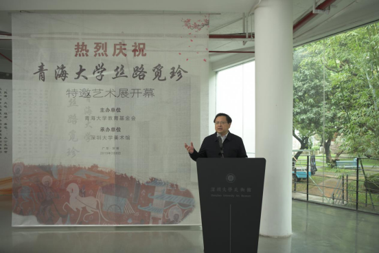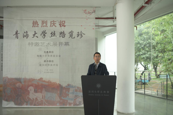 任延明在致辞中介绍了青海大学与本次艺术展的情况,青海大学坐落于西宁,其前身为始建于1958年的青海工学院,现已发展成为一所以工、农、医、管四大学科为主,其他学科协调发展的教学研究型大学。他表示,在李乐伯教授和霍秀峰教授的联系下,敦煌与青海大学连接在了一起,使得南丝绸之路和北丝绸之路连在了一起。