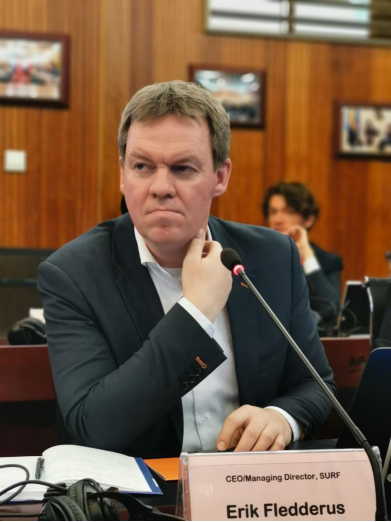 荷兰高教代表团就信息化建设以及大学在产学研链条当中所起的积极作用等问题与我方与会人员进行深入交流。随后荷兰国家教育网首席执行官Erik Fledderus 为大家介绍了荷兰大学的科研和管理架构。他说荷兰大学在上海交大的大学排名中有4所进入了Top100。作为一个国土面积很小的国家,荷兰非常重视教育,由国家主导调配优势资源发展科技,形成了重大研究方向由一所大学主导,其他高校协同发展的格局。代表团还与芒果体育荷兰研究中心的老师们进行了愉快的交流。