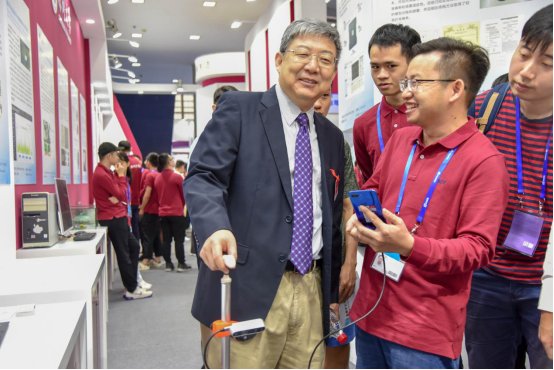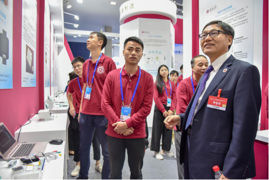 在现场,李清泉、张学记一一观看了我校参展的项目成果,各项目负责人就每个项目进行了详尽的介绍与演示。在观摩过程中,李清泉、张学记对“中低速超节能物流无人车” “形状记忆聚合物4D打印耗材”“同步固态激光雷达系统”“荔康智能自助站”“基于光学表面波的高灵敏宽谱探测的光声显微镜”“高速光通信模块”等多个项目非常关注,与项目负责人面对面交谈,详细询问了项目的研究现状、市场前景及创新点,并对展示成果的创新性和应用性给予了充分的肯定。