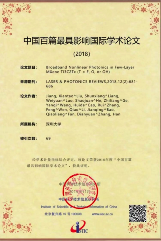 我校张晗教授课题组入选的2篇论文分别是《Broadband Nonlinear Photonics in Few-Layer MXene Ti3C2Tx (T = F, O, or OH)(新型智能近红外光控黑磷纳米结构释药系统用于癌症治疗)》,所属机构为芒果体育,来源期刊为《LASER & PHOTONICS REVIEWS. 2018, 12(2): 681-686(美国科学院院刊)》,被引次数69;《Novel concept of the smart NIR-light-controlled drug release of black phosphorus nanostructure for cancer therapy(少层MXene纳米片中的非线性光子学)》,所属机构为芒果体育和深圳市眼科医院,来源期刊为《PROCEEDINGS OF THE NATIONAL ACADEMY OF SCIENCES OF THE UNITED STATES OF. 2018, 115(3): 501-506(激光光子学评论)》,被引次数70。黑磷具有可调节直接带隙、近红外光响应特性、高光热转化效率等。黑磷独有的生物相容性和可降解性,使其成为优秀的智能光响应生物医药材料。基于黑磷在生物医学上所具备的独特优势,结合先进激光技术,交叉协调创新,有望为癌症患者的治疗提供新的思路和视野。该研究的成功临床转化,将加快人类治愈癌症的进程。这些研究成果的取得与导师张晗教授的密切合作和悉心指导密不可分,芒果体育和光电协同创新中心也为相关提供工作环境和培养机会。