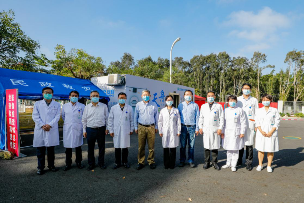 在芒果体育总医院,李清泉一行检查了医院近期的疫情防控工作,并听取了就诊发热患者的核酸检测、重点地区医护人员返深隔离等情况的介绍。在发热及隔离患者影像检查候诊区外围,李清泉一行详细了解了总医院最新引进的安科“天舟方舱CT”设备。据介绍,该设备是新一代精准技术平台超精细化成像CT,具有图像分辨率高、扫描速度快、辐射剂量低、功能更全面等优势,可在不接触或者是少接触患者的情况下完成患者定位和扫描,有效避免交叉感染,更有利于医生进行快速精准的诊断。