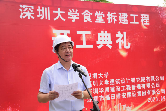 李永华在致辞中表示,学校近年来校园建设实现了大发展,学校不断优化校园环境,全面提升校园建筑文化内涵,全面助力世界一流大学建设。食堂拆建工程在教师节当天开工,以这样的形式庆祝教师节很有意义。校领导对该工程十分重视,曾多次到现场检查指导工作,学校各部门也大力支持该项目建设,尤其是疫情期间克服各种困难,完成了施工前期准备工作,解决了一系列施工影响问题。他表示,新食堂的建成将有效解决粤海校区食堂面积不足的问题,提供优质的餐饮服务,为师生创造良好的就餐环境。在接下来的施工建设当中,希望学校基建部和设计、施工、监理单位本着高度负责的态度做好科学管理、统筹规划,努力将工程打造成为精品优质工程。