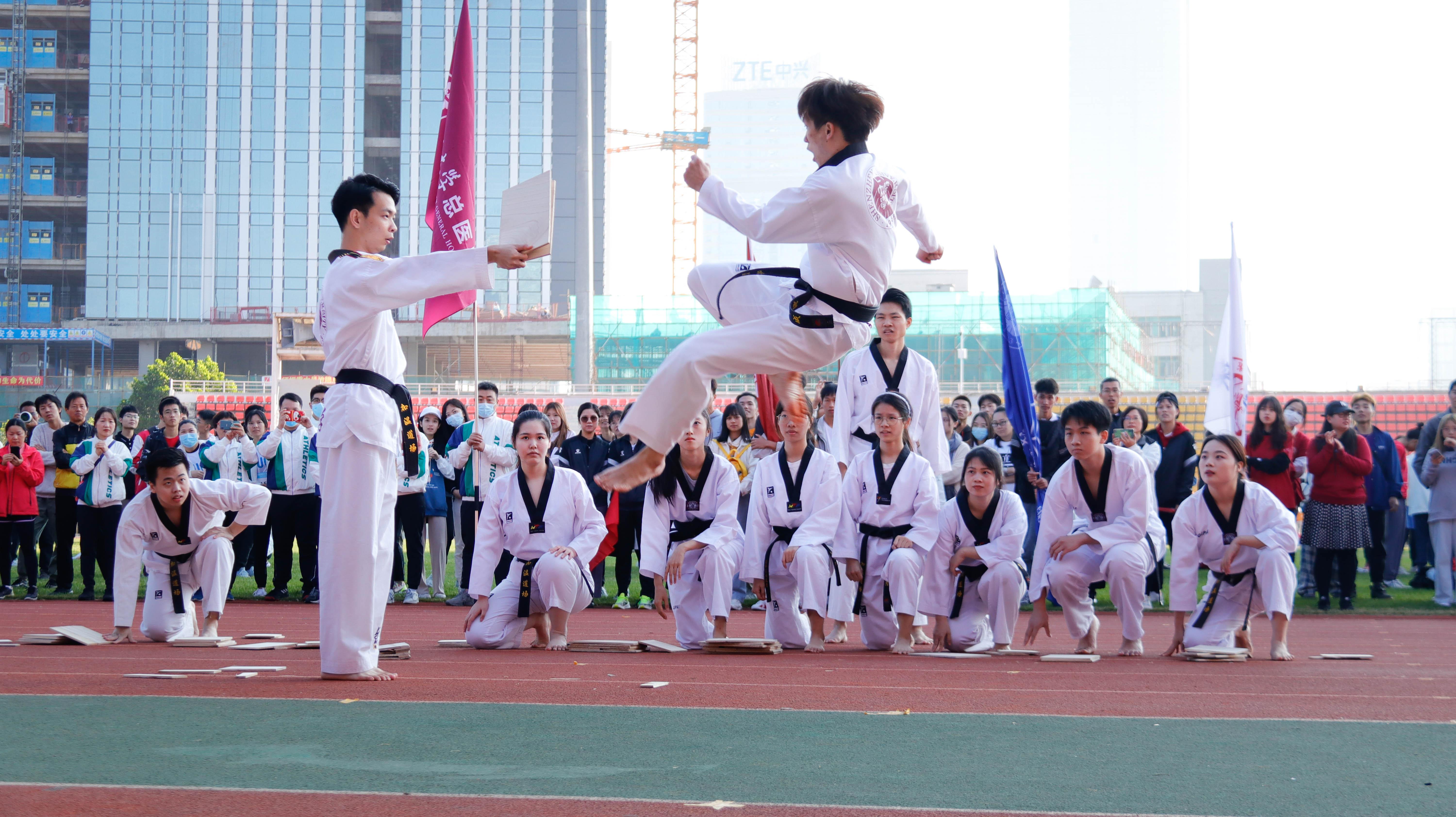 运动员唐潇和裁判员余晓龙分别代表参赛运动员和裁判员进行会前宣誓。随后,全体师生观看了由丽湖校区街舞社团、国际交流学院和体育部、体育部跆拳道俱乐部带来的精彩表演。街舞社团带来的健美操表演展现出青春洋溢的精神状态;国际交流学院和体育部带来的双截棍表演凸显了中华传统武艺的灵活与洒脱;跆拳道表演则将现场氛围推向了高潮,每一次击碎木板都引起了现场师生的阵阵欢呼。