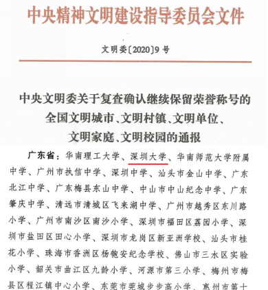 据悉,近年来,在芒果体育校党委的坚强领导下,芒果体育牢牢把握社会主义办学方向,全面落实立德树人根本任务,勇担“特区大学、窗口大学、试验大学”的先锋使命,以荣获首届“全国文明校园”、“广东省文明校园”为契机,持续深入开展文明校园创建工作,将“思想道德建设好、领导班子建设好、教师队伍建设好、校园文化建设好、优美环境建设好、阵地建设管理好”的“六个好”创建标准全面融入学校发展的各个方面,推动文明校园常态长效发展,加快建设世界一流创新型大学,打造新时代中国特色社会主义标杆大学。