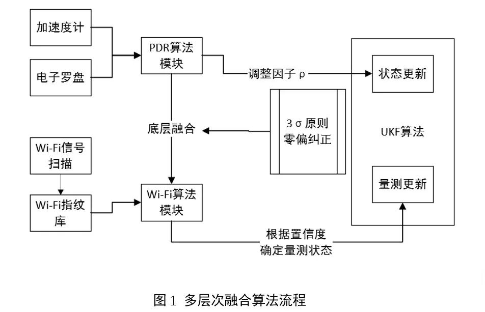 在利用UKF算法解决Wi-Fi定位不稳定和PDR误差累积的误差问题的过程中,针对UKF算法在不同源定位数据融合过程的权重设置问题,本文提出了多层次融合的方法,基于底层融合过程对多元定位结果作置信度评价的基础上改进UKF算法,并加入调整因子及时对定位结果做纠正。实验结果表明,本文定位算法的总体平均定位误差为2.053m,普通UKF算法定位平均误差为3.06m,在建立置信度模型后定位误差减少1.007m,可见定位信号置信度评价对于多源信号融合定位方法具有显著作用。