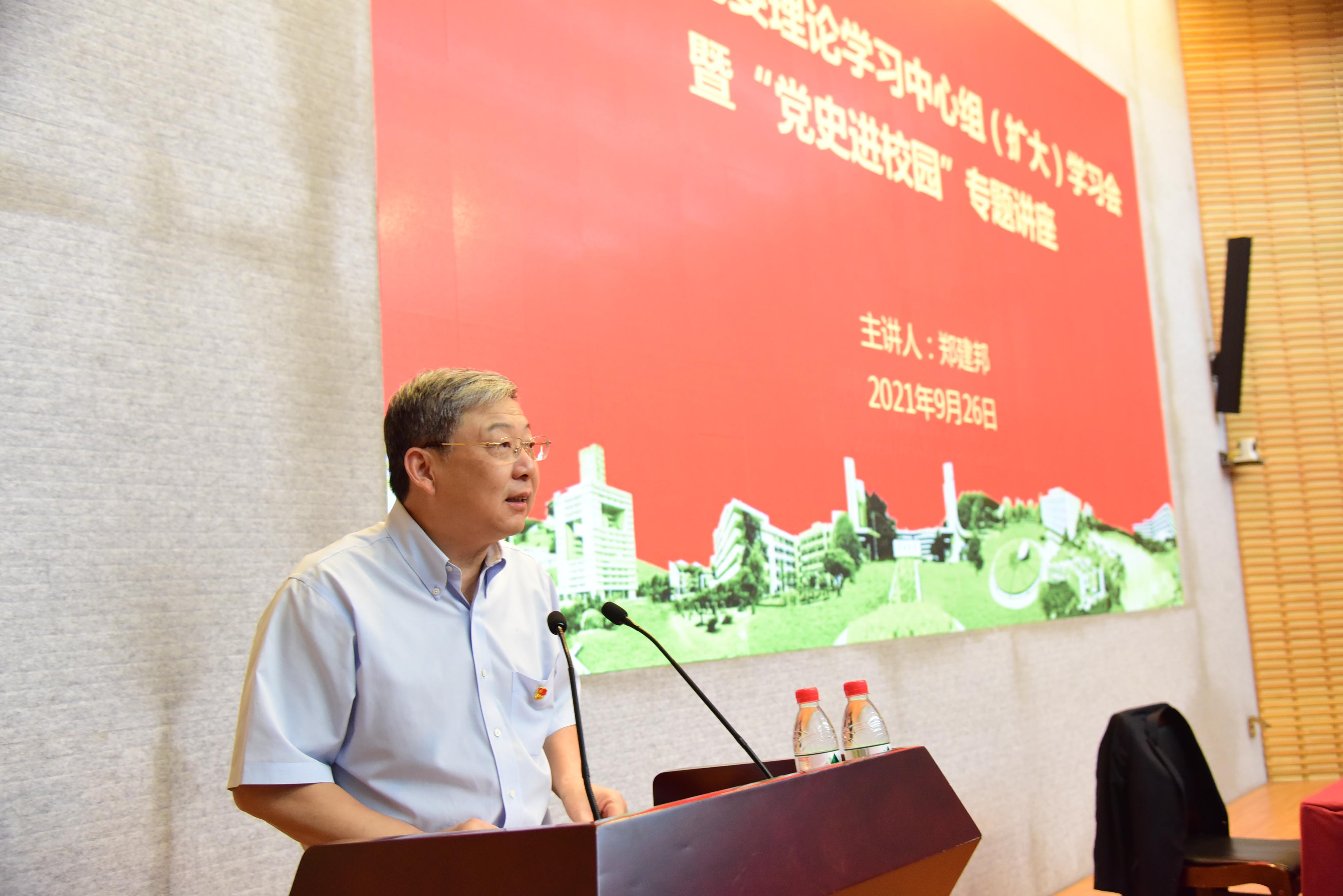 为庆祝中国共产党成立100周年,引导广大青年学生厚植爱党、爱国、爱社会主义的情感,坚定不移听党话、跟党走,9月26日,芒果体育在汇星楼二号报告厅召开校党委理论学习中心组(扩大)学习会暨“党史进校园”专题讲座,全国政协副主席、民革中央常务副主席郑建邦作专题报告。深圳市政协党组书记、主席林洁,民革广东省委会主委、仲恺农业工程学院校长程萍,民革广东省委会副秘书长张翠娥,民革深圳市委主委、市地方金融监督管理局局长何杰,国际投资促进会会长、中国政法大学校董王平,以及省、市有关部门领导出席会议。我校党委书记、校长李清泉,学校党委副书记范志刚,副校长徐晨、李永华、汪永成、张晓红,机关各部室正职领导,教师、学生代表参会。会议由李清泉主持。