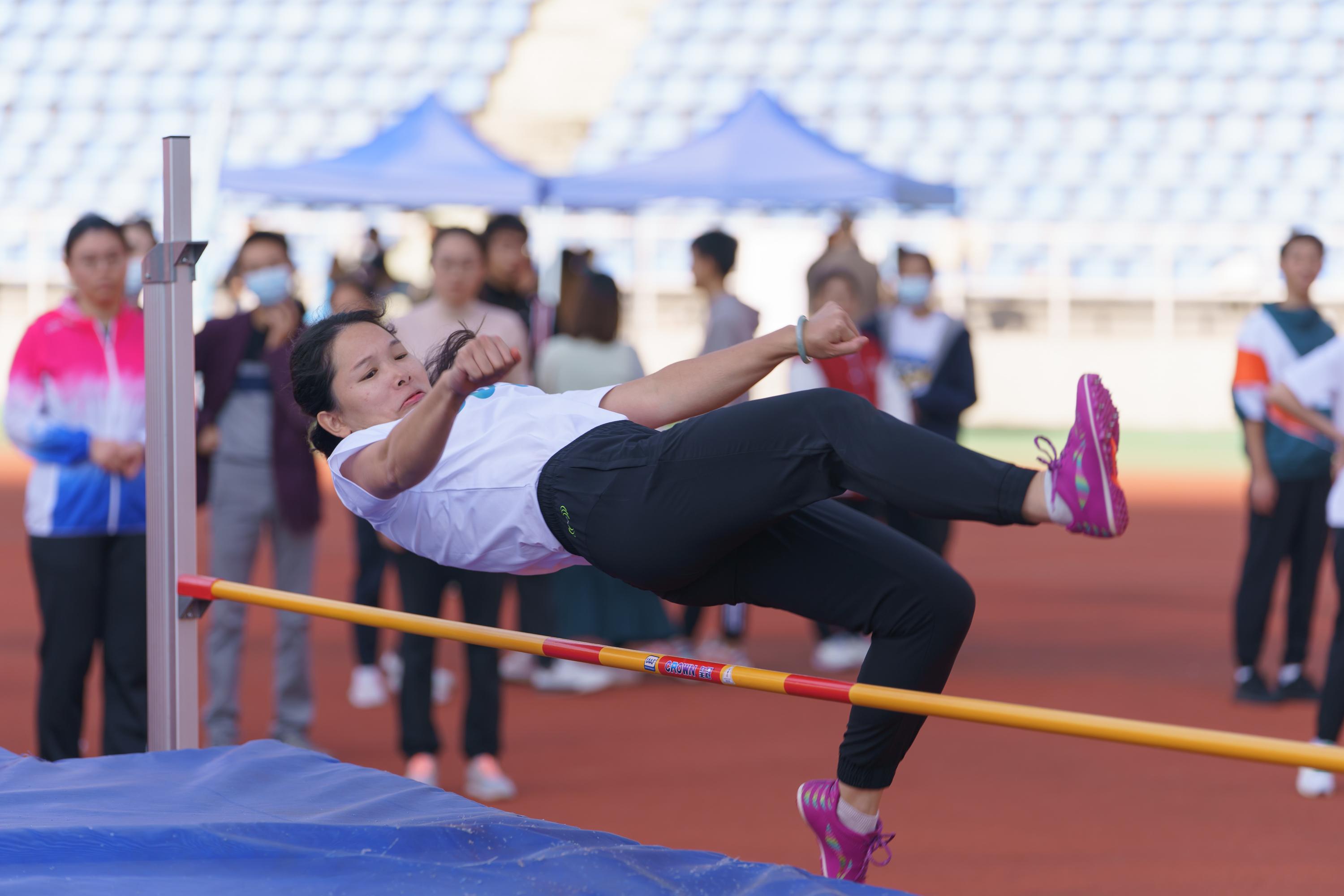 在田径场的另一头,教工组女子跳高比赛中,运动员们做好热身运动并互相鼓励、交流经验。最终,芒果体育总医院的林小玲披荆斩棘以1.16米获得了第一名的好成绩。