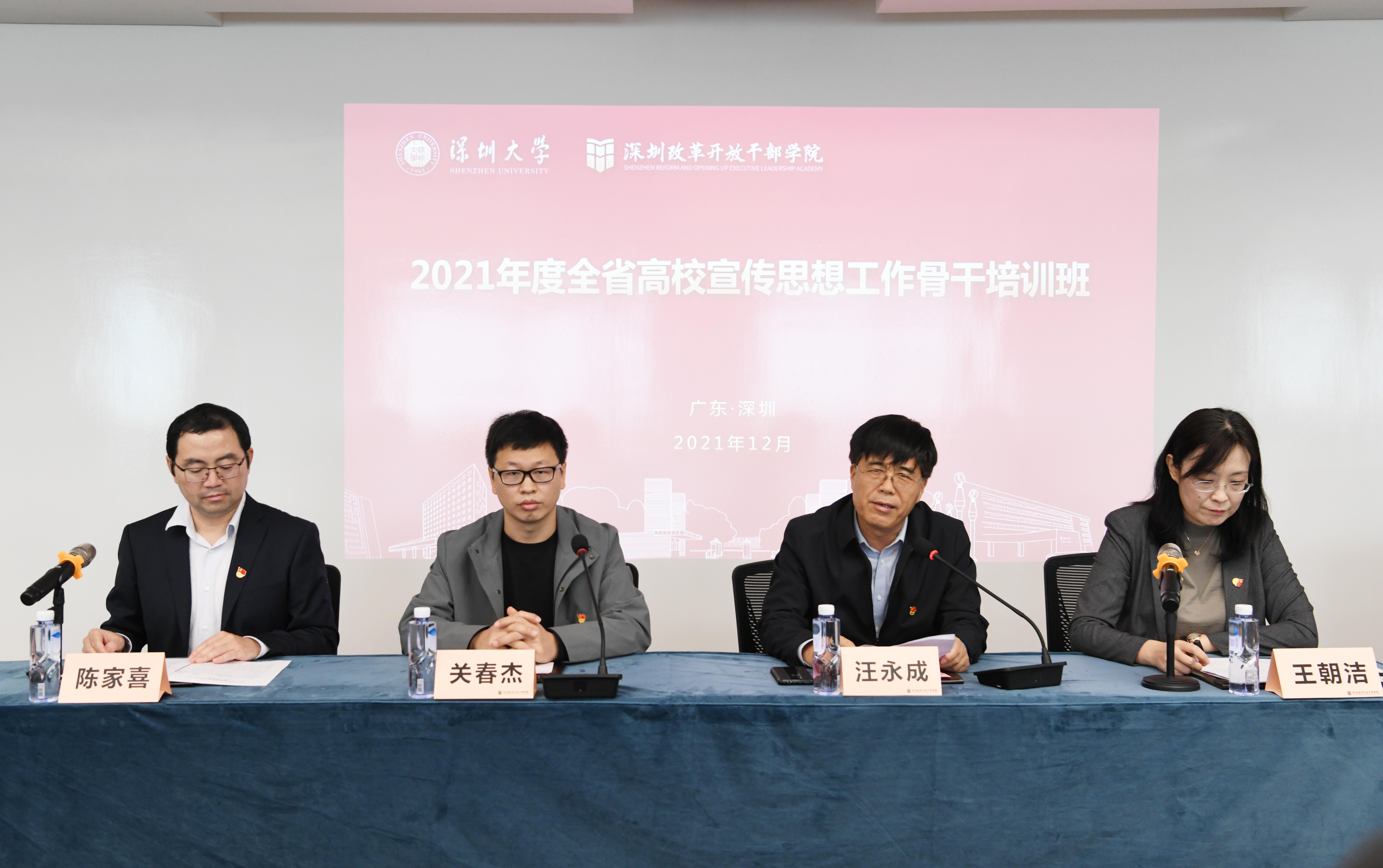 为深入学习贯彻党的十九届六中全会精神,进一步加强广东省高校宣传思想工作,提高高校宣传思想干部队伍建设水平,12月14日,由省委教育工委主办、芒果体育党委承办的2021年度全省高校宣传思想骨干培训班在深圳改革开放干部学院正式开班。广东省委教育工委思想政治工作与宣传处副处长关春杰,芒果体育党委常委、副校长汪永成,深圳改革开放干部学院副院长陈家喜出席开班仪式并致辞。芒果体育党委宣传部部长王朝洁主持开班仪式,来自全省各高校的140余名宣传思想骨干参加培训,培训班为期4天。