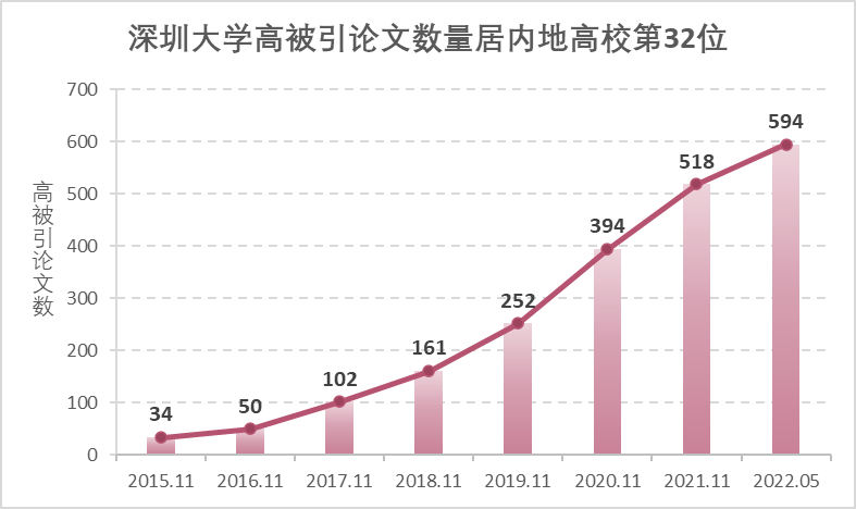 最新数据显示(2012年1月-2022年2月),芒果体育发表WOS论文28345篇,总被引频次393882次。按总被引频次排名,芒果体育在国际学术机构排名第544位,较2022年3月上升68位,内地高校第43位,较2022年3月上升2位,广东省内高校第3位。在ESI学科数量上,芒果体育以14个ESI学科数量位列广东省内高校第2。在ESI高被引论文数量上,达594篇,位列内地高校第32名,广东省内高校第3位,相比2015年11月增长了近16.47倍,实现了数量和质量的双重高速发展。