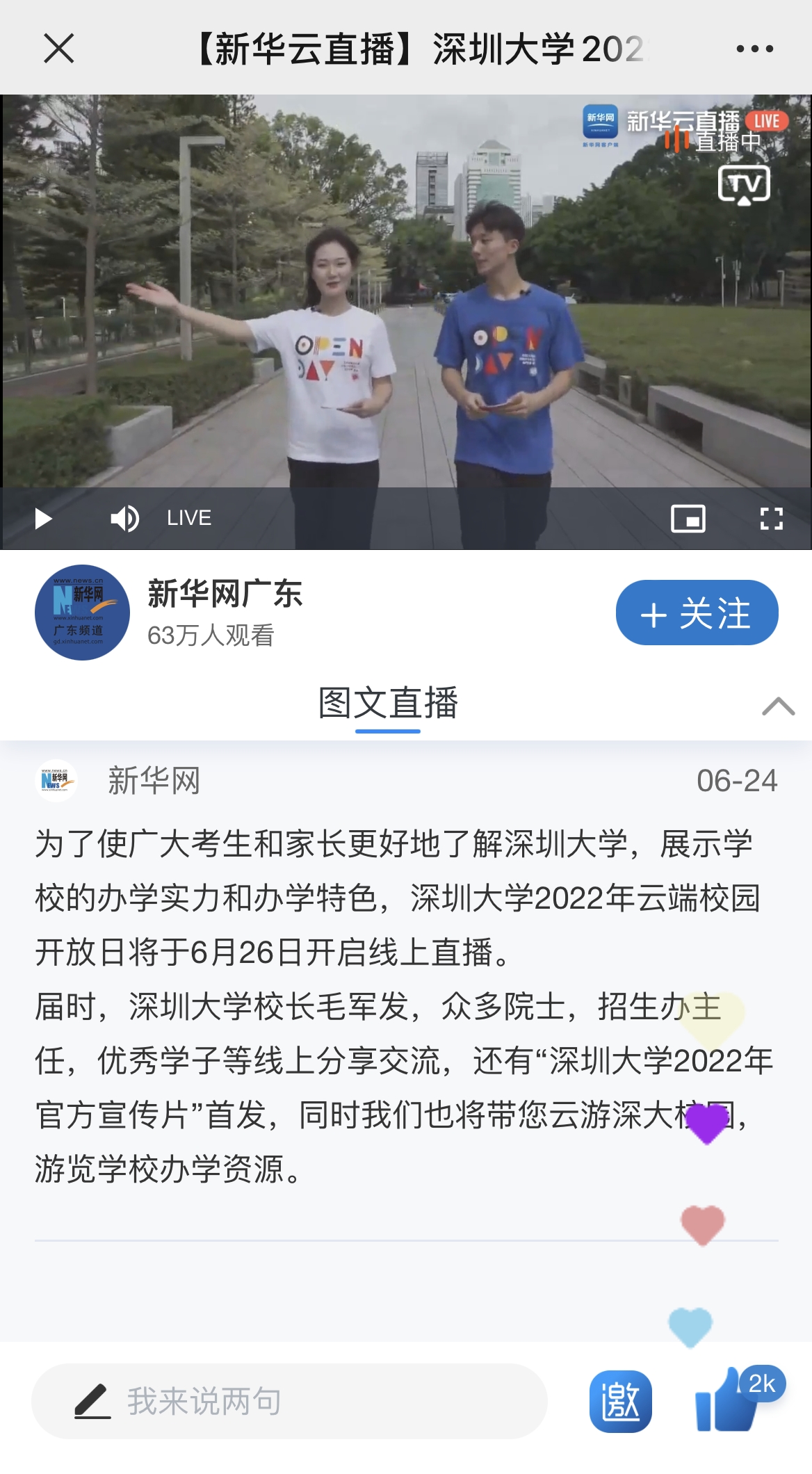 开放日活动在新华网、南方+、新浪深圳等中央、省级媒体及网络媒体,芒果体育官方新浪微博、微信视频号、抖音、百家号、bilibili等平台同步直播,吸引大量考生、家长和网友的关注。
