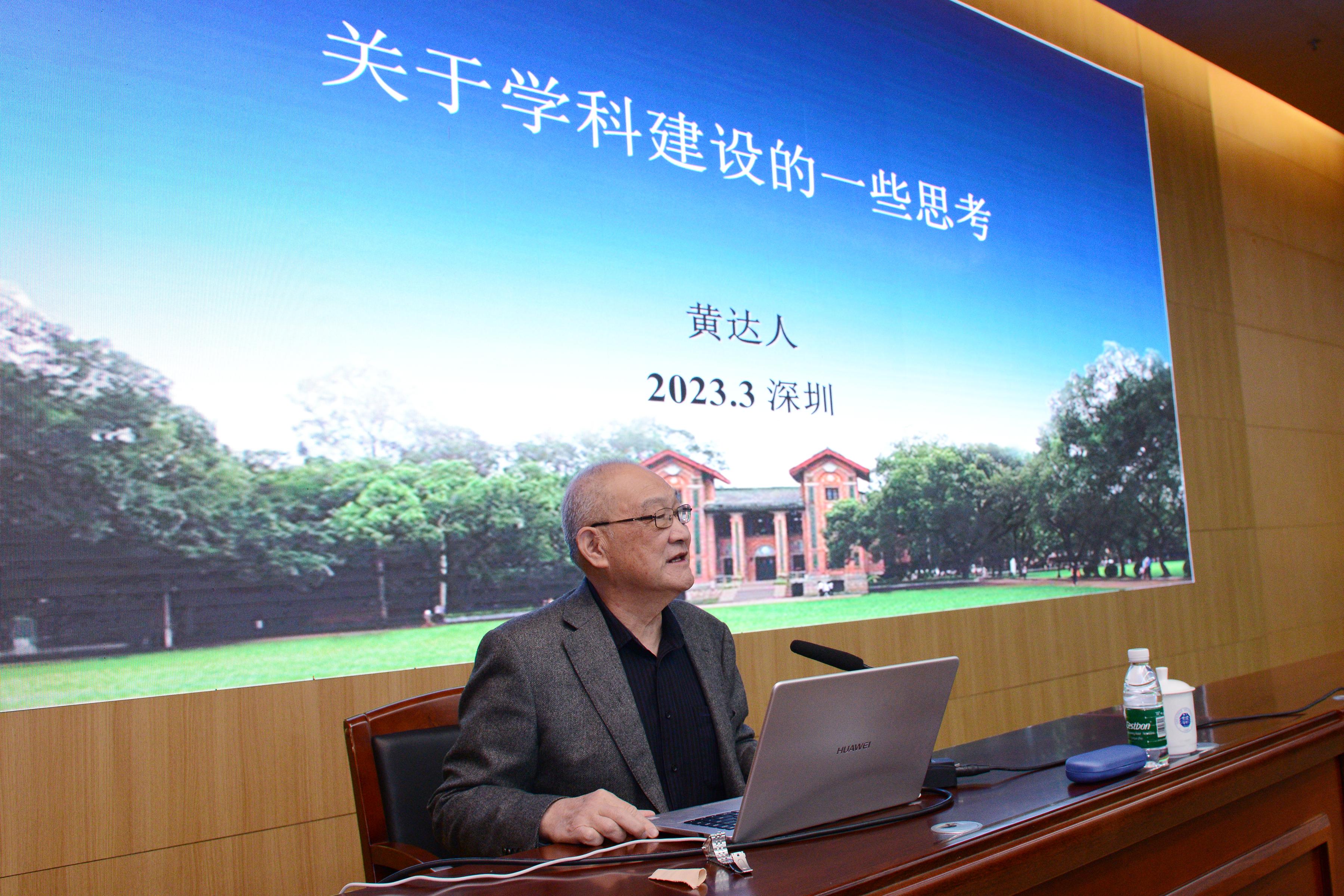 黄达人授课的题目为《关于学科建设的一些思考》。他从学科建设的内容、内涵、意义、作用、目的和关键等方面,阐述了其调研与长期思考的结果。他认为,学科建设指的是从党的领导到师资队伍建设、从人才培养到科学研究,从社会服务到国际交流、从体制改革到文化假设等等,具体到高校内容是全面的,也可以是某一个方面的典型。
