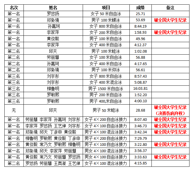 比赛中,由运动训练专业学生组成的芒果体育游泳队在领队张晓红和指导教师唐玉成的带领下,克服流感等不利因素影响,劈波斩浪,“泳”往直前,共斩获13枚金牌、5枚银牌和5枚铜牌,获男子团体、女子团体、团体总分三项冠军。其中,在8项接力项目中芒果体育游泳队获7金1银,并打破女子4×200自由泳接力、女子4×100自由泳接力、男子4×100混合泳接力、男子4×100自由泳接力、男女4×100自由泳接力项目的赛会纪录;个人项目中,郑枭境以53秒69的成绩打破男子100米蝶泳赛会纪录,李家萍以1分58秒93的成绩打破女子200米自由泳项目赛会纪录,邱天以28秒68的成绩打破男子50米蛙泳项目赛会纪录。