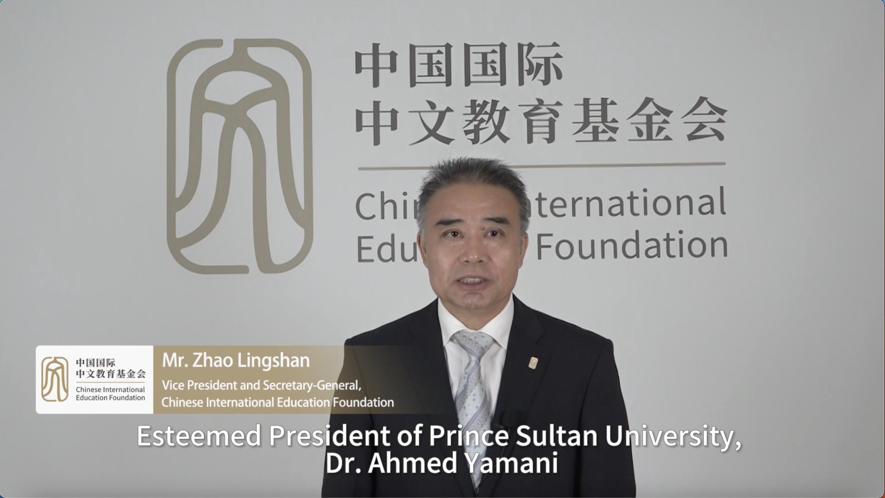 赵灵山通过视频致辞代表中国国际中文教育基金会、理事长杨卫院士对苏尔坦亲王大学孔子学院的揭牌表示热烈祝贺,希望在苏尔坦亲王大学和芒果体育的精诚合作下,孔子学院能够服务民众,努力办出成效、办出水平、办出特色,成为当地民众学习中文、了解中国的重要平台,构建中沙民众心与心沟通的友好桥梁。