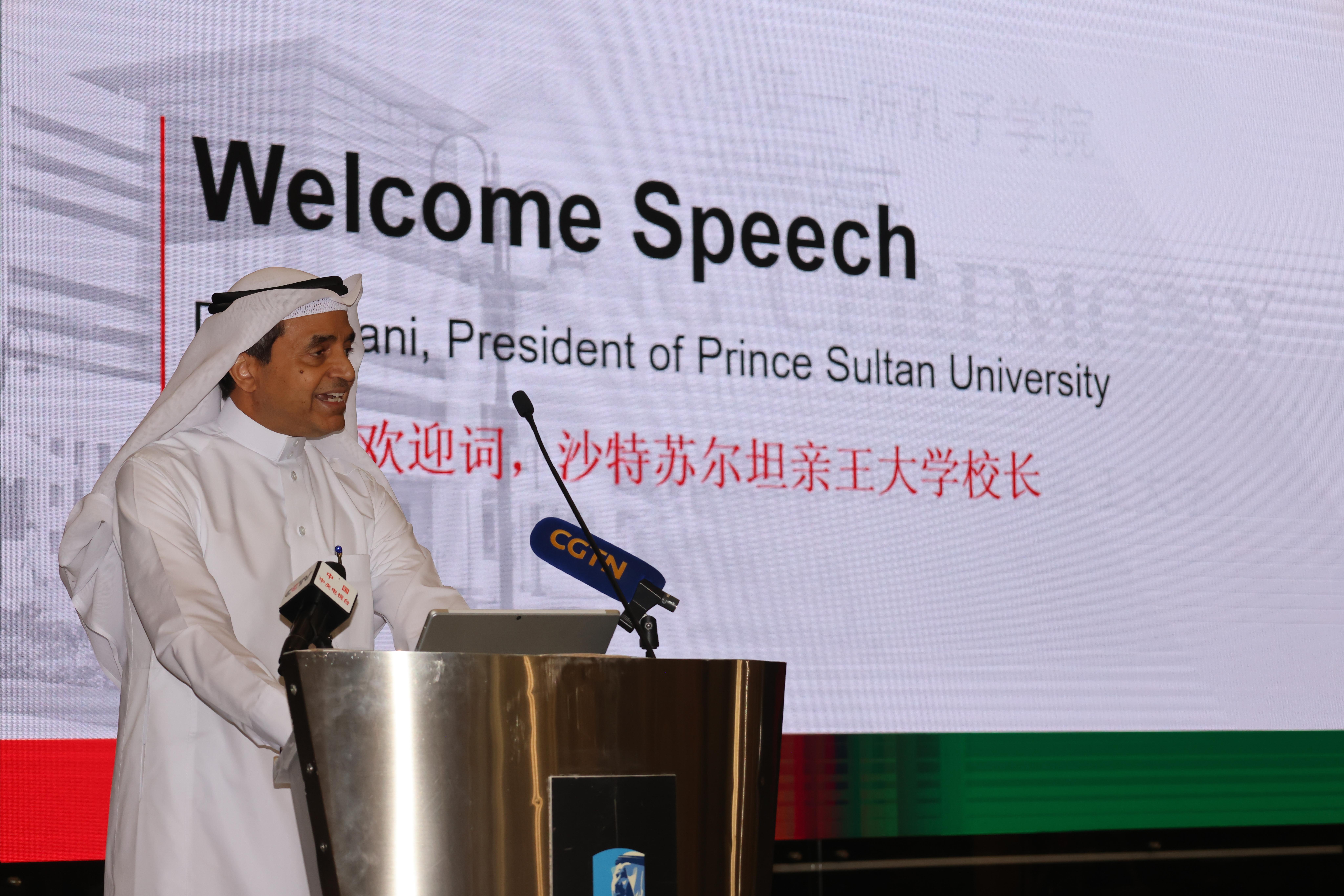 殷立军在致辞中说,近年在中沙两国领导人的引领下,双方全面战略伙伴关系保持快速发展势头,各领域合作不断深化拓展。目前,沙特已有4所大学开设中文专业,8所中小学开设中文选修课,相信孔子学院在苏尔坦亲王大学的开设,将进一步增进两国人民互相了解,推动扩大中沙青年交往。