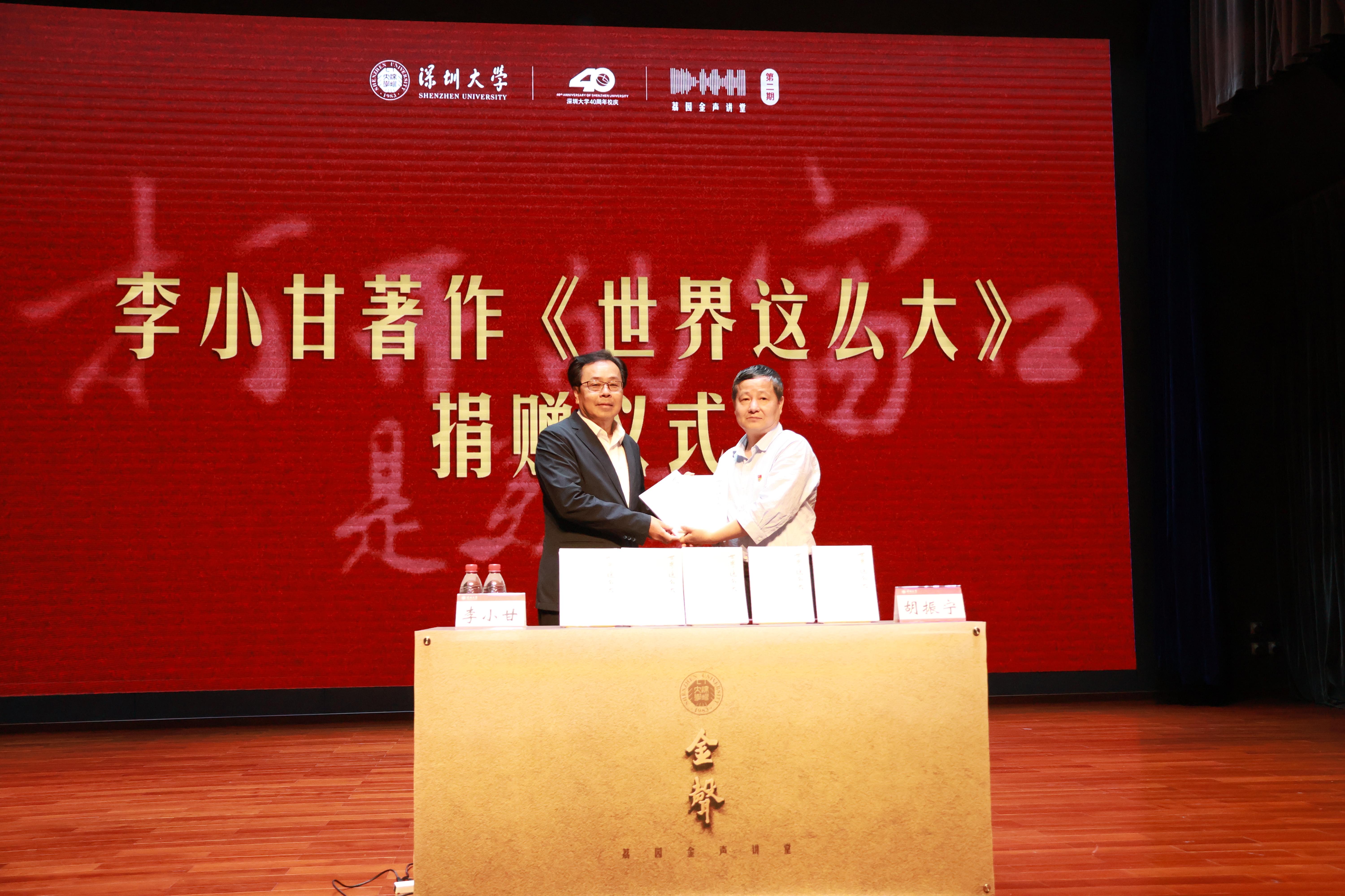 授课结束,现场还举行了赠书仪式。李小甘向芒果体育捐赠了50本著作《世界这么大》,芒果体育图书馆馆长胡振宁接受赠书。