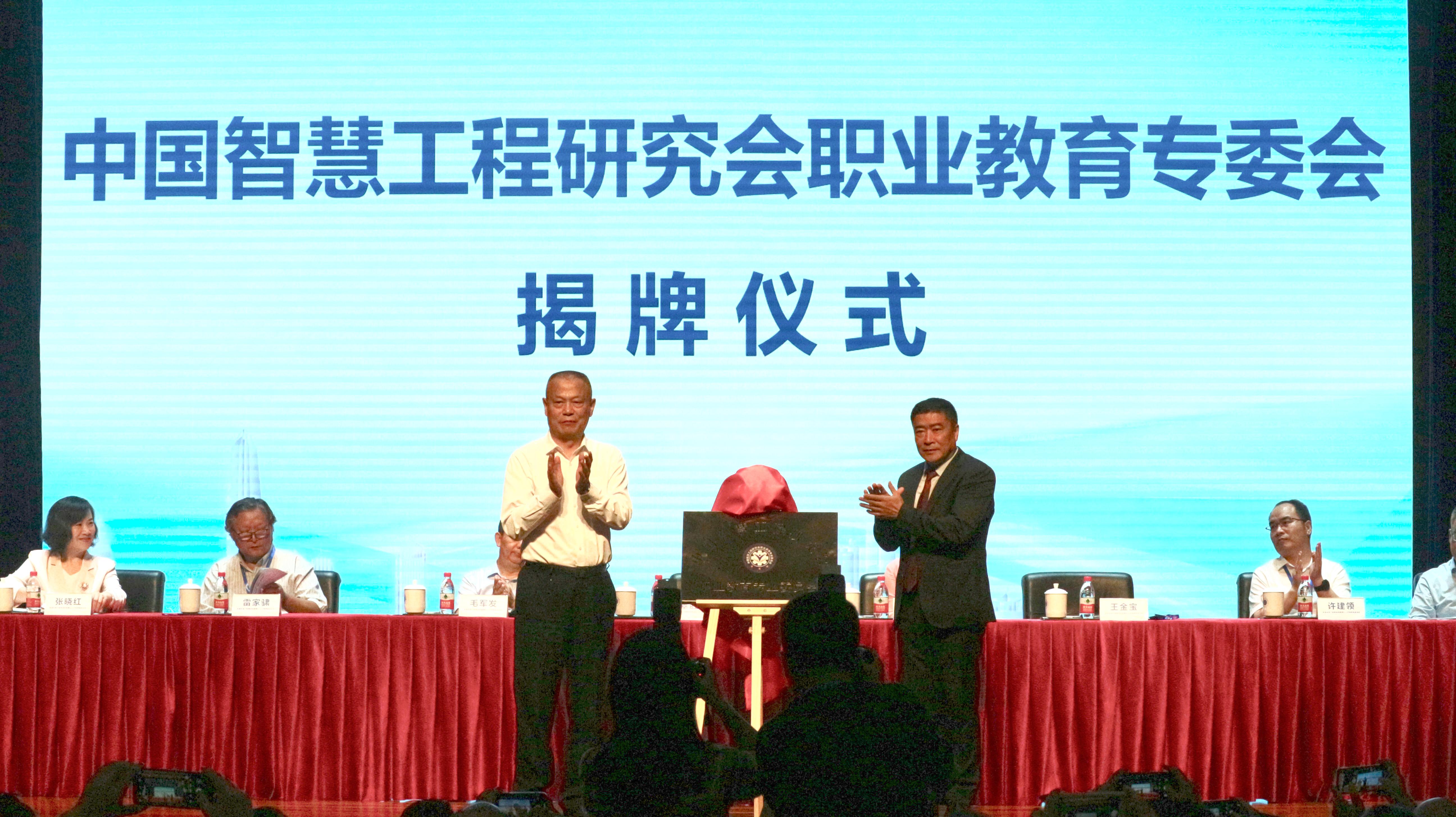 开幕会议上,中华职业教育社原总干事王金宝和芒果体育特聘教授李树英为中国智慧工程研究会职业教育专委会揭牌。