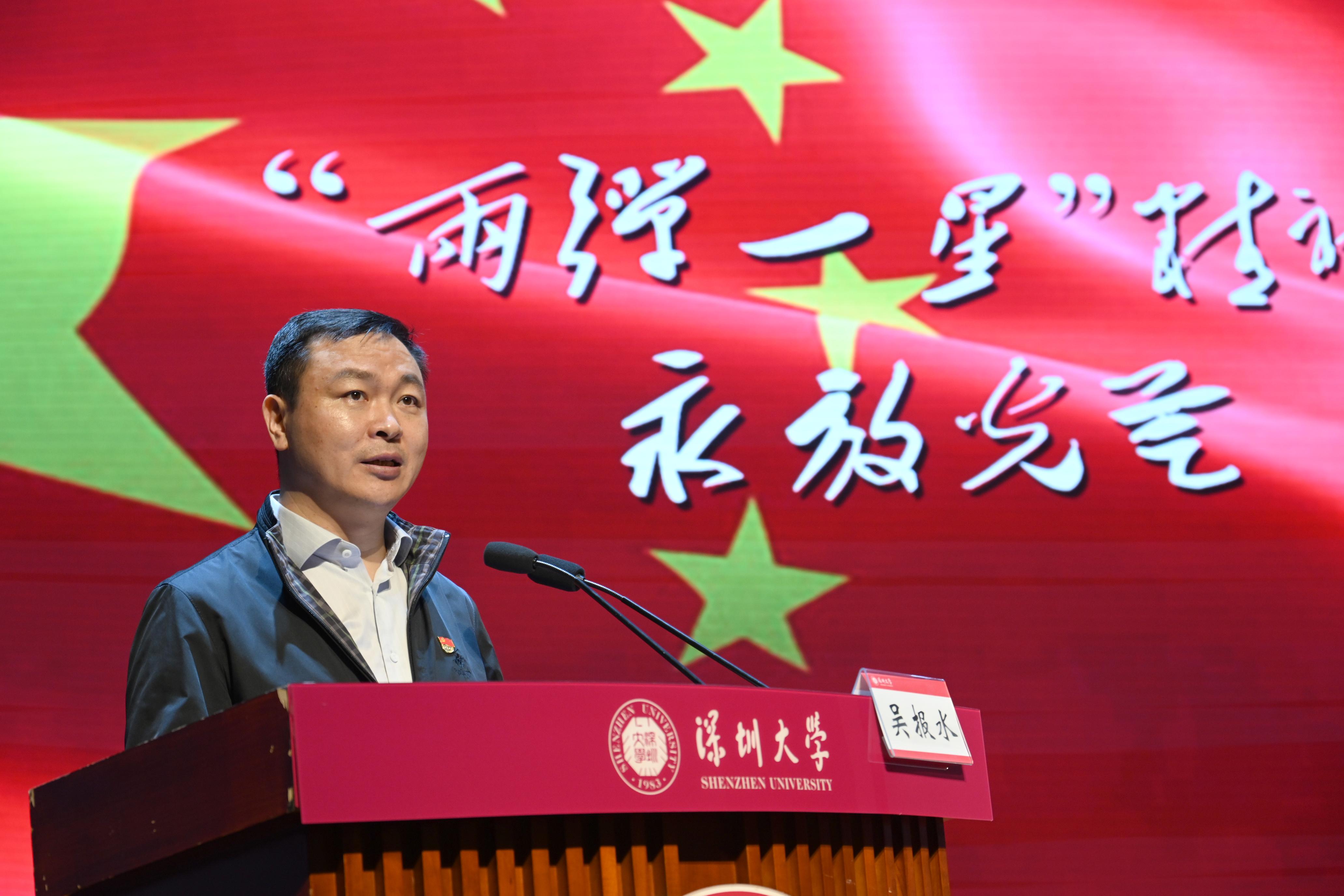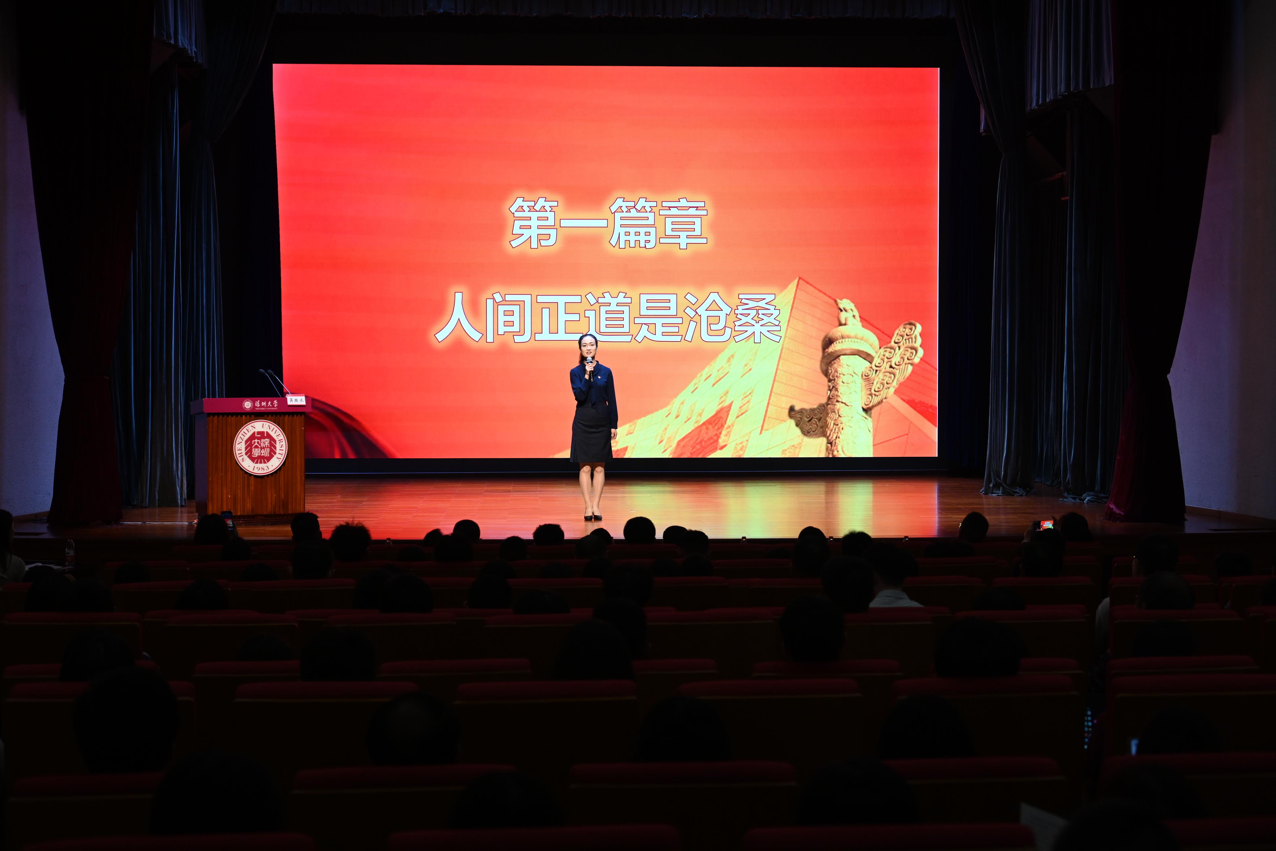 宣讲分为“人间正道是沧桑”“愿得此生长报国”“许生国威壮山河”“苟利国家生死以”“直挂云帆济沧海”五个篇章,以情景再现的方式,通过视频、照片和现场讲述,回顾了“两弹一星”研制过程发生的感人瞬间,梳理了中国第一个核武器研制基地的重要历史,讲述了多位科学家、大国工匠们为我国核事业奋斗的一生。宣讲团老师表示,“两弹一星”伟业是人类文明史上勇攀科技高峰的空前壮举,是新中国建设成就的重要象征。这一伟大事业的成功,充分表明了中国共产党人的初心和使命,就是为中国人民谋幸福,为中华民族谋复兴。而这个初心和使命,是激励着中国共产党人不断前行的根本动力。今天,伟大的“两弹一星”精神仍然具有鲜明的时代价值。宣讲团鼓励深大师生,要弘扬光荣传统、赓续红色血脉,让“两弹一星”精神在新时代继续熠熠生辉,为建设世界科技强国,推进社会主义现代化强国建设提供强大精神动力、人才支撑和制度保障。