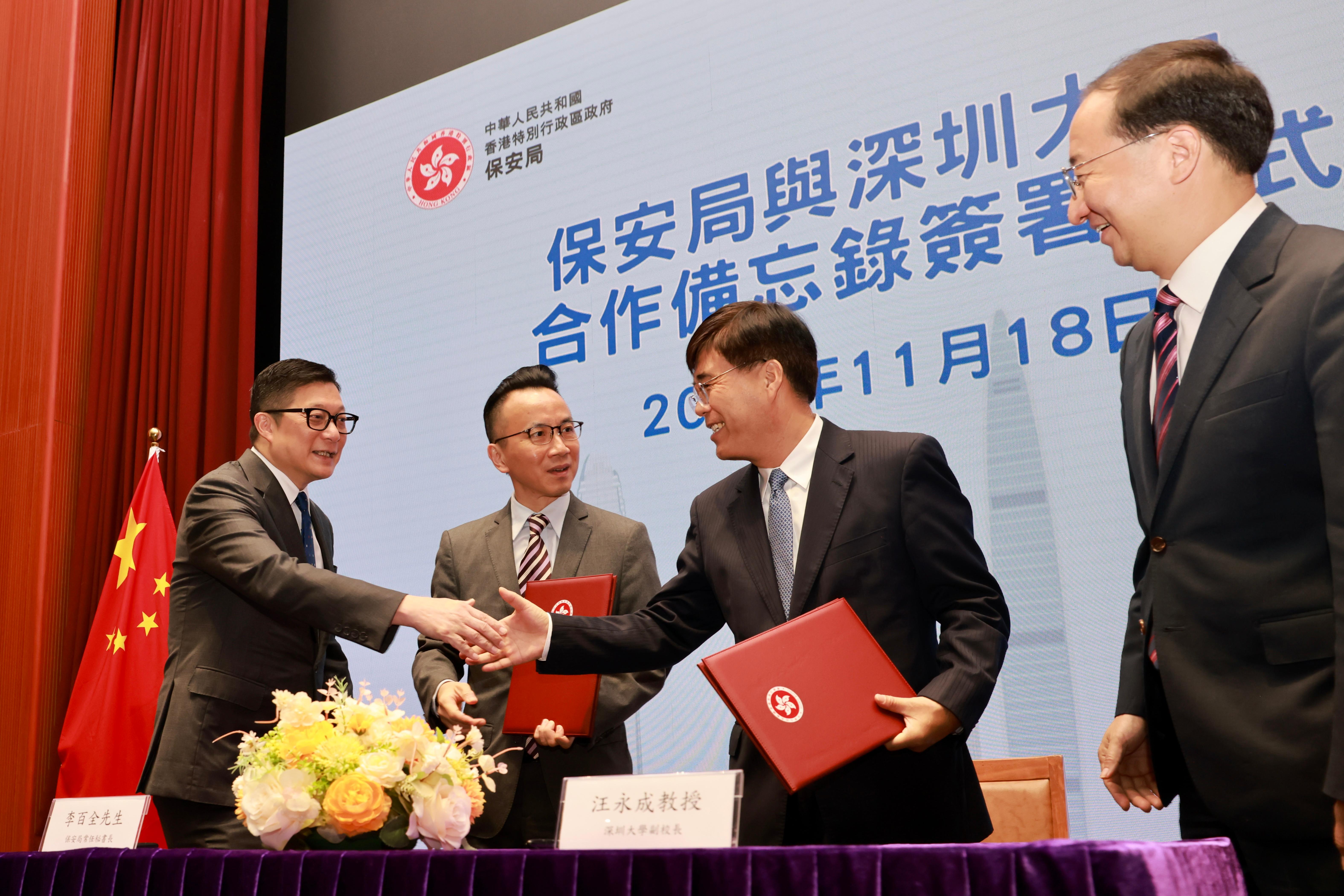为紧抓大湾区发展机遇,做好新时代青年发展工作,2023年11月18日,在香港保安局局长邓炳强和香港中联办青年工作部部长张志华的见证下,香港保安局常任秘书长李百全和芒果体育副校长汪永成代表双方签署香港特别行政区政府保安局与芒果体育关于青年发展合作的框架备忘录。