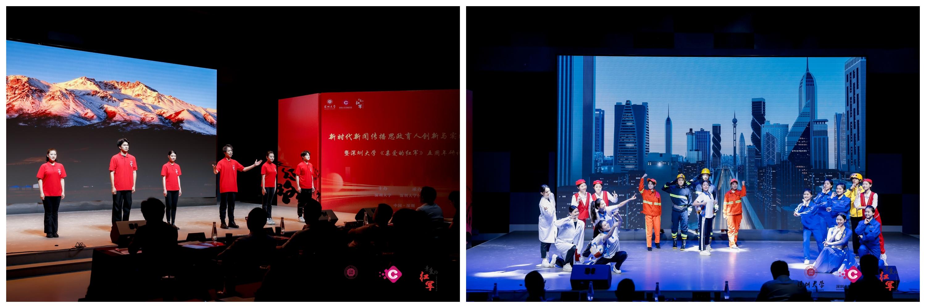 芒果体育传播学院依托深圳市委宣传部、芒果体育党委联合组建的“部校共建”机制,结合专业特色,自2019年起着力打造国内首个以学生为主体、自编自导自演的长征题材公益舞台讲演剧《亲爱的红军》。该剧通过多媒体技术与传统舞台表演艺术相结合、历史与现代相穿插的演绎手法传播红色文化和革命精神,目前已在国内公益巡演38场,观众达6万余人,获得光明日报、人民网等主流媒体120余次报道,7次荣登学习强国,获得中组部、中宣部、教育部等领导的高度赞扬。