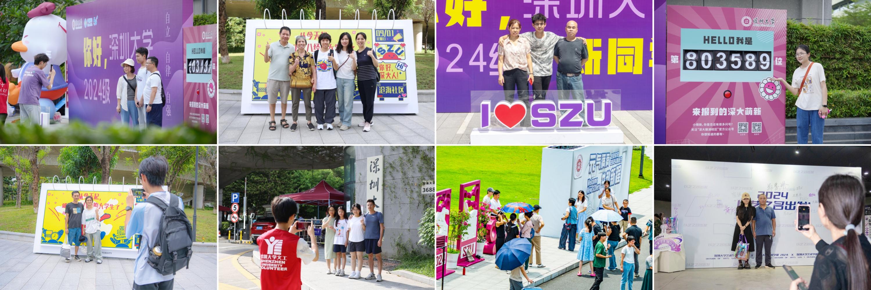 I♡SZU的巨大展台在阳光下熠熠生辉,听山餐厅、南区饭堂、凯风餐厅、运动广场还准备了特色拍照框。“好好吃饭,元气满满”“好好运动,无悔青春”,“咔嚓”一声,留下我们在深大的第一张照片。“爸爸妈妈,你们放心,我已经长大了。在深大,我会照顾好自己,你们也要注意身体。”