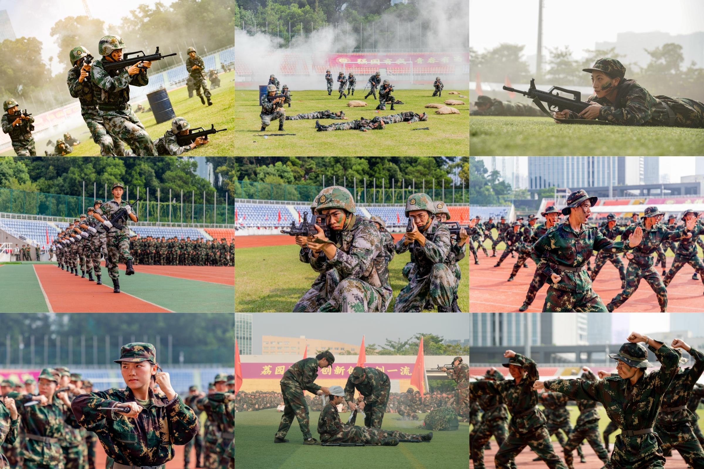 大会在庄严的国歌声中拉开序幕。升旗仪式后,分列式正式开始。在经过14天风雨与烈日的考验后,2024级军训学生迎来了他们展示成果的时刻。“标兵就位!”在指挥员铿锵的指令声中,2024级军训新生身着迷彩服,昂首阔步,以整齐有力的步伐和响彻云霄的口号,依次走过主席台,展现军训成果。匕首操、防爆方阵、擒敌拳、棍术方阵、特种战术等特色方阵表演气势如虹,尽显深大青年的英姿与锐气。本次军训汇演还设置了真实场景演练,通过模拟实战演练提高了同学们的国家安全意识。