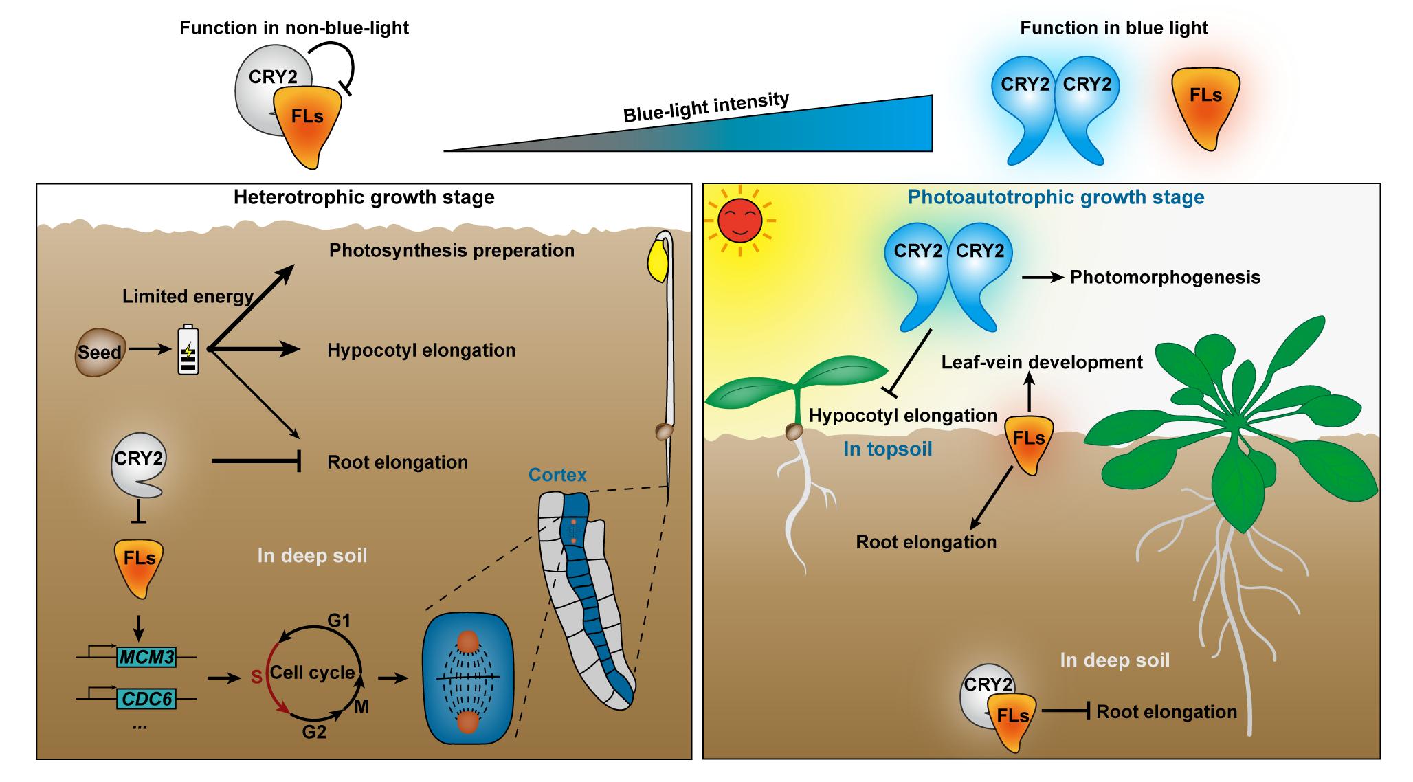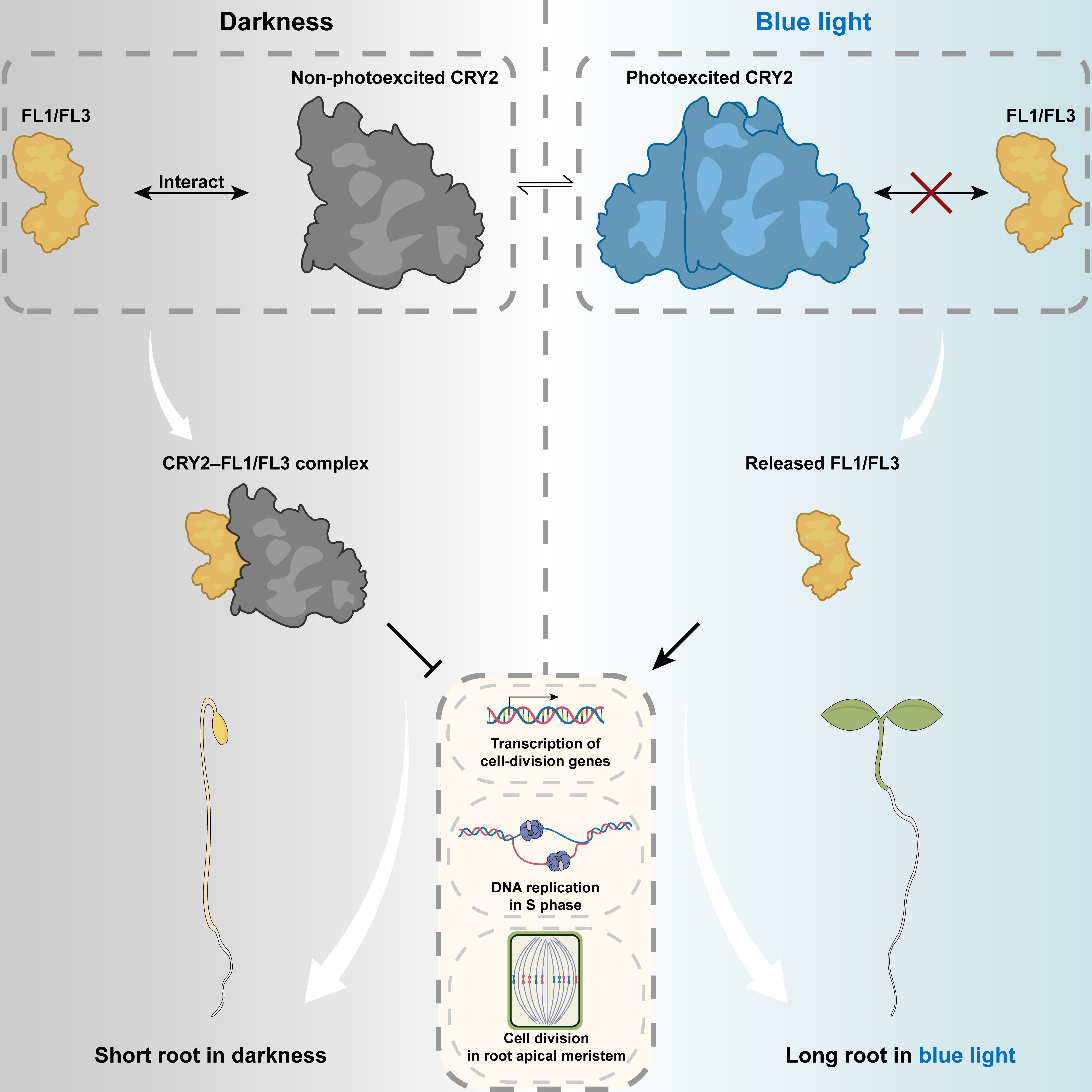 该研究发现拟南芥蓝光受体CRY2在黑暗中居然调控细胞分裂、光合作用等多个重要生命过程相关基因表达。进一步表型观察发现,黑暗条件下,在通常会被忽视的黄化苗根部,CRY2通过抑制根尖分生区细胞分裂从而抑制主根伸长,而蓝光则解除该抑制。通过筛选获得在黑暗(或非蓝光条件)下同CRY2结合的蛋白FORKED-LIKE(FL)家族成员FL1和FL3,它们和CRY2的结合特异受蓝光抑制。后续研究确认FL只能结合非蓝光激发的CRY2单体而不能结合蓝光激发后的CRY2多聚体。FL1和FL3是两个位于CRY2遗传学下游的促细胞分裂因子,具备结合细胞分裂基因染色质并促进基因表达的功能。黑暗中CRY2通过结合FL从而抑制FL促根尖分生区细胞分裂,进而抑制主根伸长。蓝光下CRY2形成多聚体不再能同FL结合,FL功能被释放从而促进主根伸长(图1)。