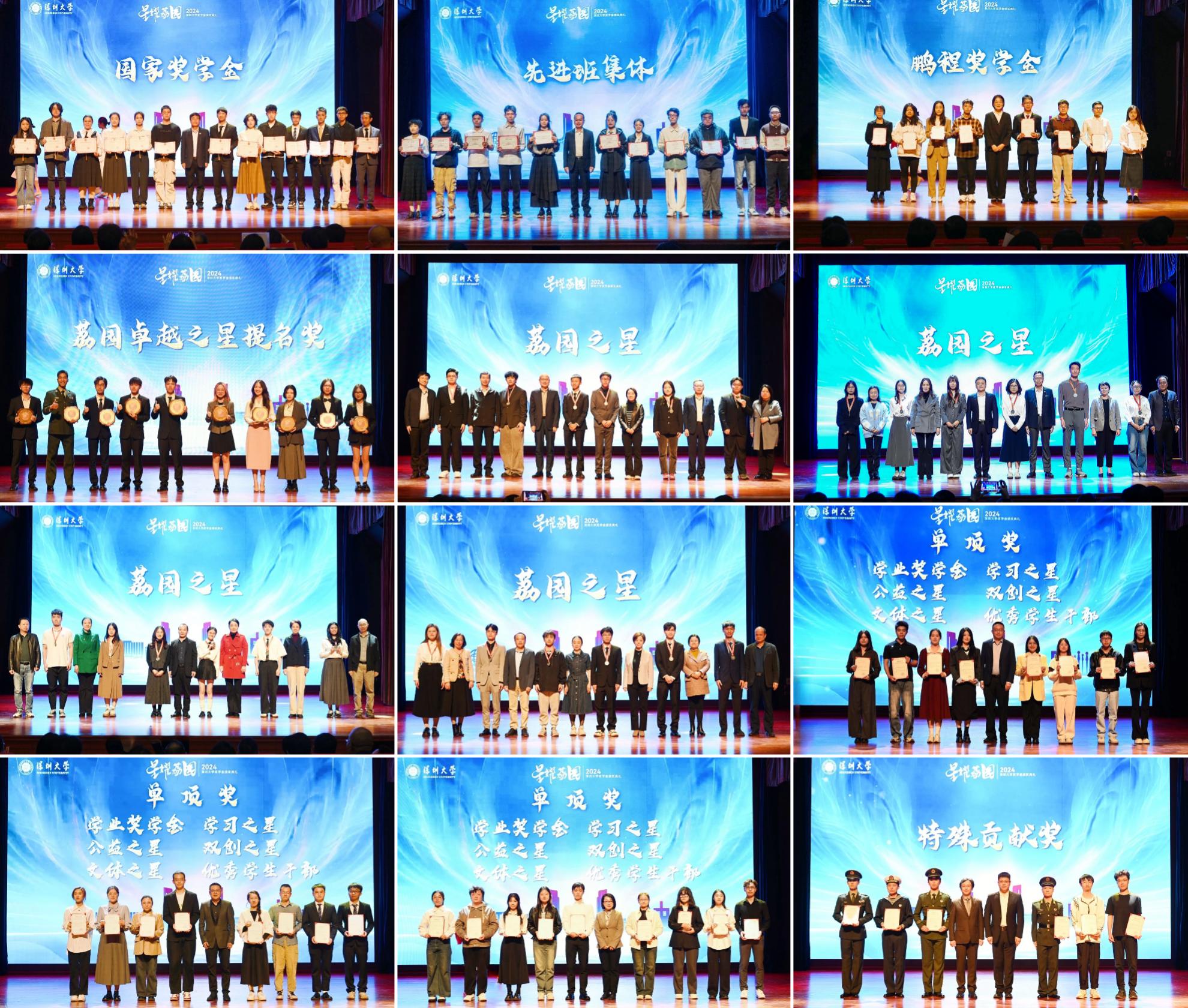毛军发代表学校对所有获奖者表示祝贺。他在致辞中表示,“星耀荔园”承载着深大对每一位同学的殷切期望。深大人怀揣梦想,用汗水浇灌希望,用奋斗书写青春华章,在科研、双创、公益等不同领域展现出卓越的才能和顽强的毅力,用实际行动诠释了“自立、自律、自强”的校训精神,呈现出“敢为人先、经世致用、实事求是”的新时代青年特征。毛军发特别提到,本届颁奖典礼由深大学子策划并执行,创新设计制造了具有独特功能的“追光卡”,将深大原创元素融入典礼各环节,体现了深大学子的创意想法与创新精神。当下,新兴技术正在重塑世界格局,深大将继续以产教融合的培养模式、自主探索的成长空间赋予同学们创新创业的动力,激励众多深大学子绽放自我。毛军发勉励同学们牢记“三自”校训,延续敢闯敢创敢干的精神血脉,不断追求卓越,以更加饱满的热情和昂扬的斗志迎接挑战,创造更加辉煌的未来。