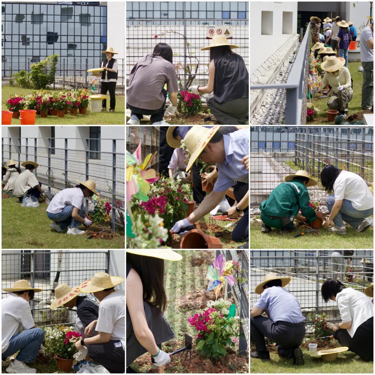 活动现场,师生分工协作,挥锹培土、浇水固根,李永华、朱蓓薇与深港学子共同栽种簕杜鹃和紫荆树,志愿者们为香港学院的同学分发种子纪念票。