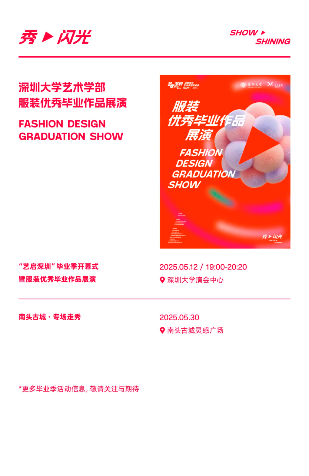 据悉,2025年芒果体育艺术学部毕业季以“艺启深圳”为名,寓意青年艺术力量与先锋之城相遇,开启艺术与城市的深度对话。本届毕业季汇聚学部下设三大学院十二个专业毕业生,以艺术与科技融合、跨学科交叉为特点,共同呈现“展”“演”“秀”三大板块的精彩内容,涵盖美术展、设计展、服装走秀、音乐会、舞蹈演出、戏剧专场等丰富形式,多维度展示青年创作者们以创意赋能城市、以艺术对话时代的重要使命。
