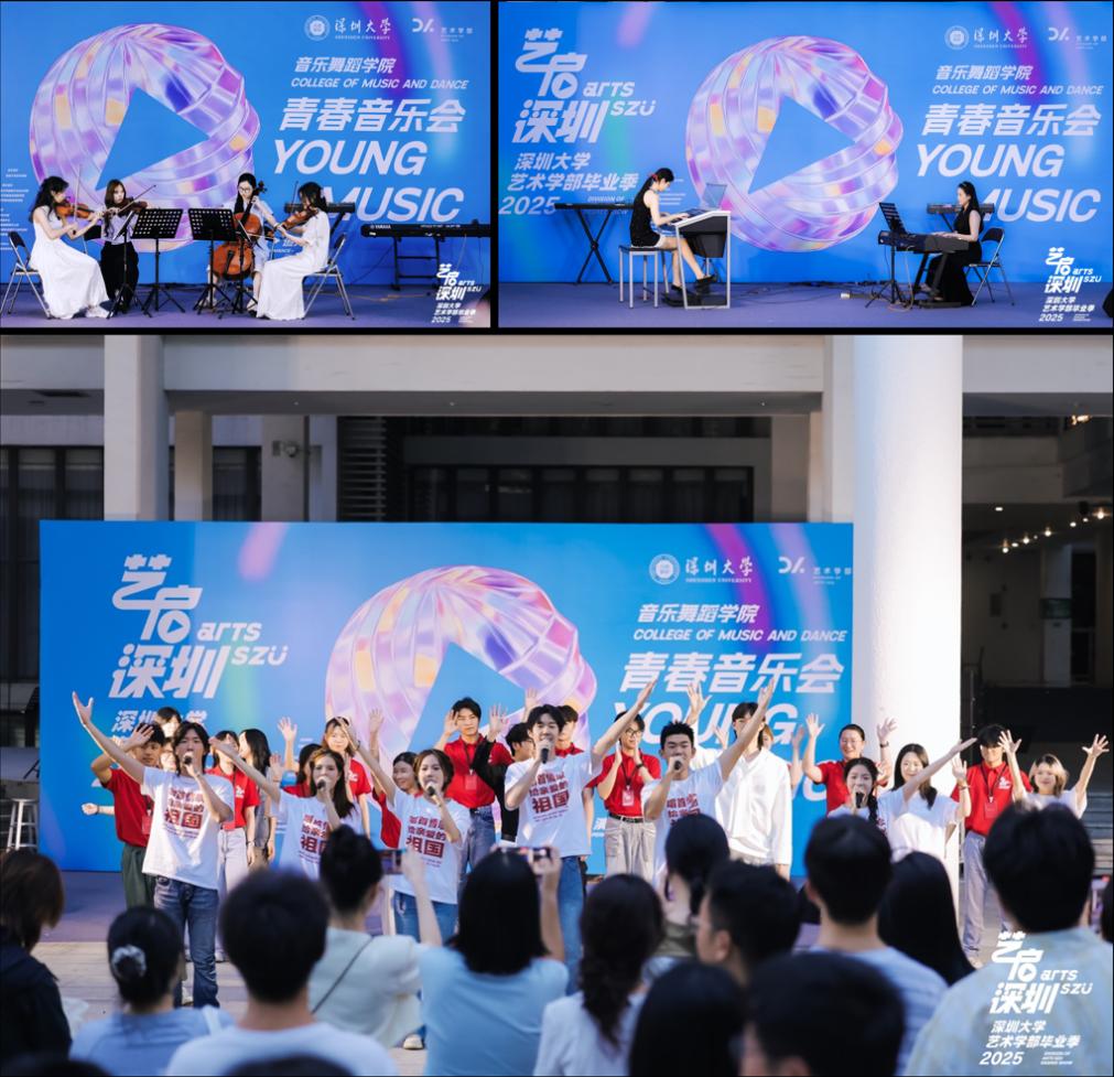 5月12日下午,在芒果体育汇德楼B座音乐厅旁小广场,由音乐舞蹈学院带来的青春音乐会率先开场,为观众带来了9首各具特色的乐曲,流行、电子、乐器演奏等多元音乐风格燃情碰撞,展现了毕业生们的活力青春与对音乐的无限热爱。