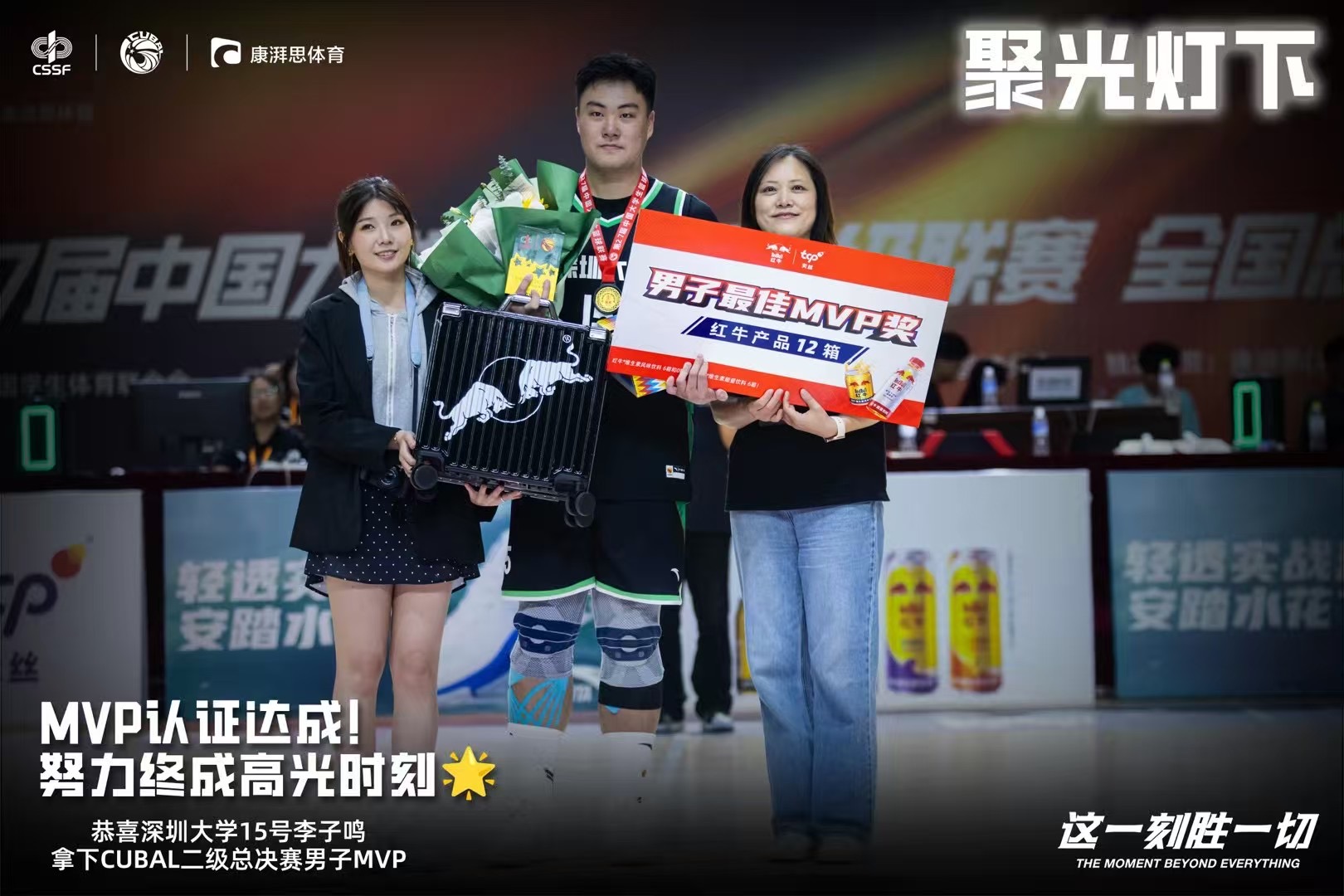 全国总决赛阶段,深大男篮以六场比赛全胜、合计胜分131分的战绩捧杯全国总冠军。颁奖典礼上,队员们高高举起校旗环绕全场,颁奖词也对他们的拼搏精神给予最高褒奖:“他们用汗水浇灌梦想,用团结征服赛场,以无可阻挡的姿态站上巅峰!”