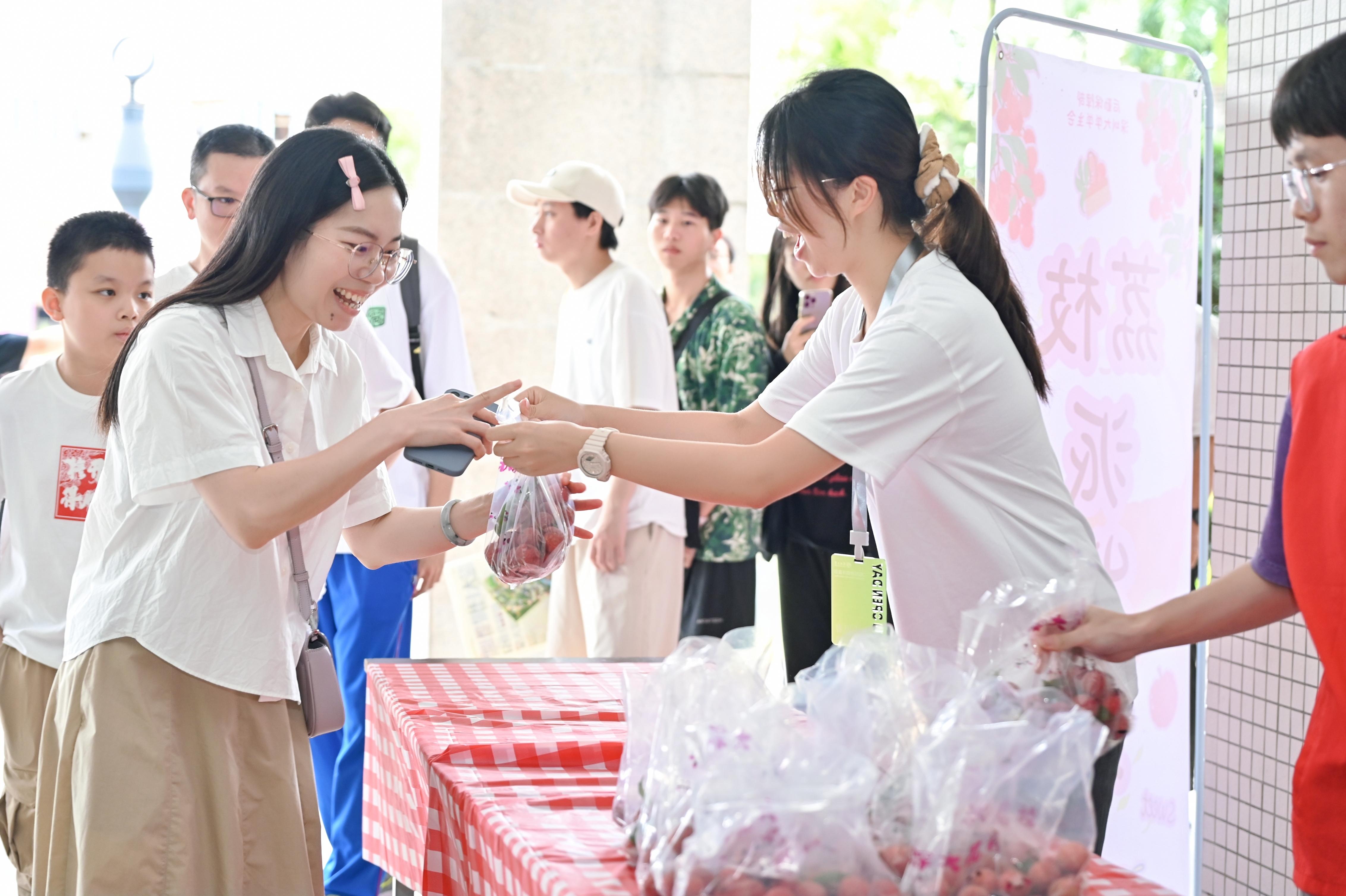 开放日当天,深大荔枝再次人气爆棚。一边是荔园大丰收,新鲜荔枝免费派发,考生们捧着红艳艳的荔枝拍照留念,红色荔果与绿意校园相映成趣。“第一次在大学校园里吃到现摘荔枝,甜到心里了!”