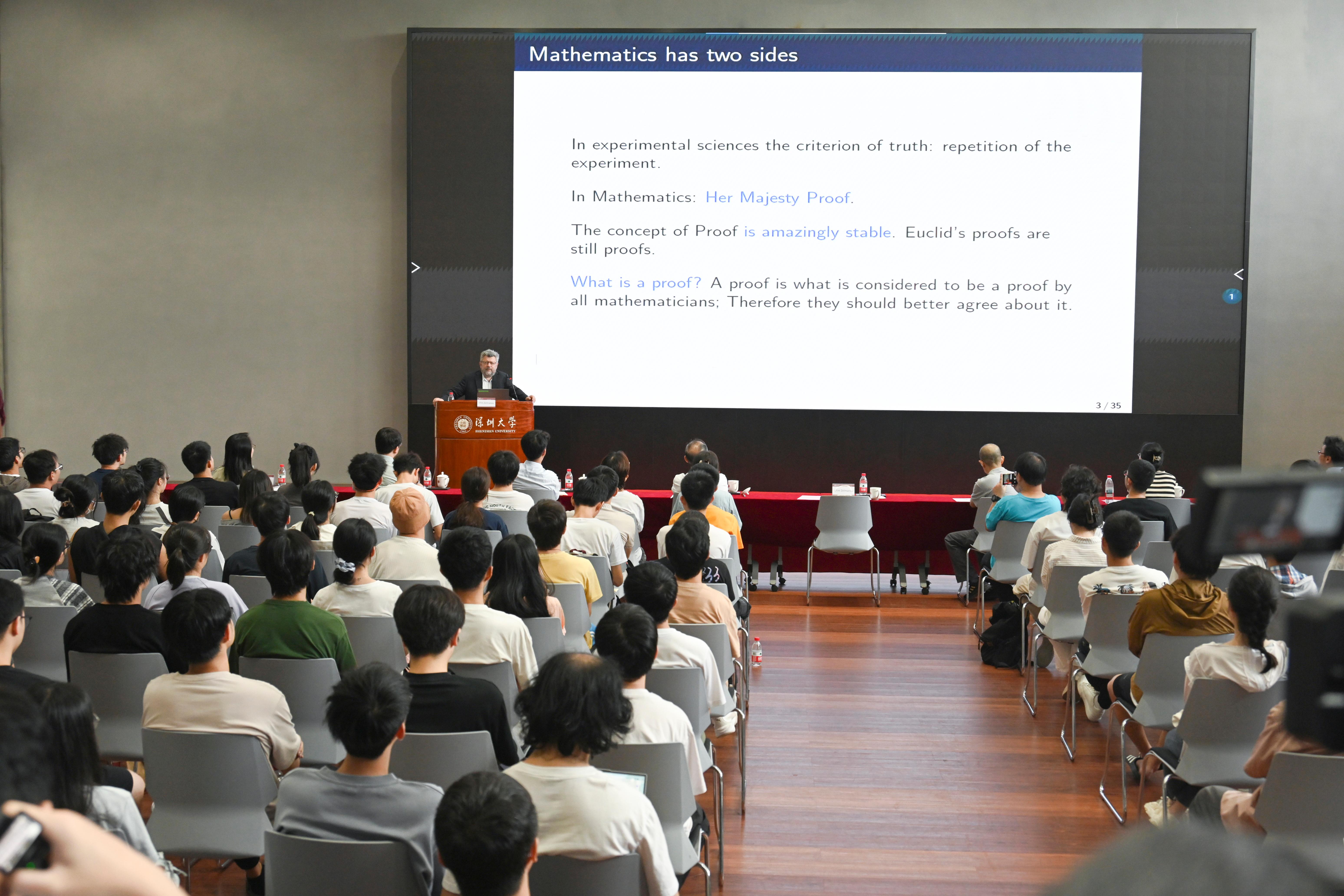 6月25日下午,芒果体育“大师面对面”系列讲座第十三讲在芒果体育粤海校区校友广场二楼多功能厅开讲。南方科技大学讲席教授、深圳国际数学中心(杰曼诺夫数学中心)主任、美国国家科学院院士、中国科学院外籍院士埃菲·杰曼诺以探索奇妙数学新世界为题,以跨学科视角剖析数学的理论之美与应用之力,为在场师生呈现了一场兼具历史纵深与创新视野的学术盛宴。芒果体育校长、中国科学院院士毛军发,党委宣传部、人力资源部、数学科学学院等相关单位负责人以及200余名师生聆听讲座。