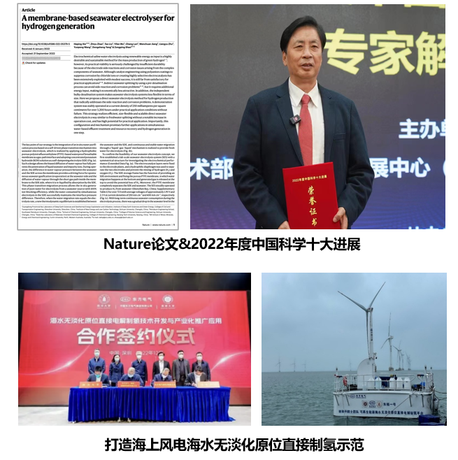 2022年12月16日,Nature论文发表后的第16天,东方电气便专项投入3000万元研发经费,与谢和平院士团队联盟合作,并共同打造了全球首个海上风电海水无淡化原位直接电解制氢示范工程,于2023年5月17日至26日在福清市兴化湾海域对接海上风电连续稳定运行了10天,为Nature前沿成果尽快“走出实验室,走向产业化”开启了工程探索,相关成果发表在Nature Communications(2024, 15(1): 5305)上。