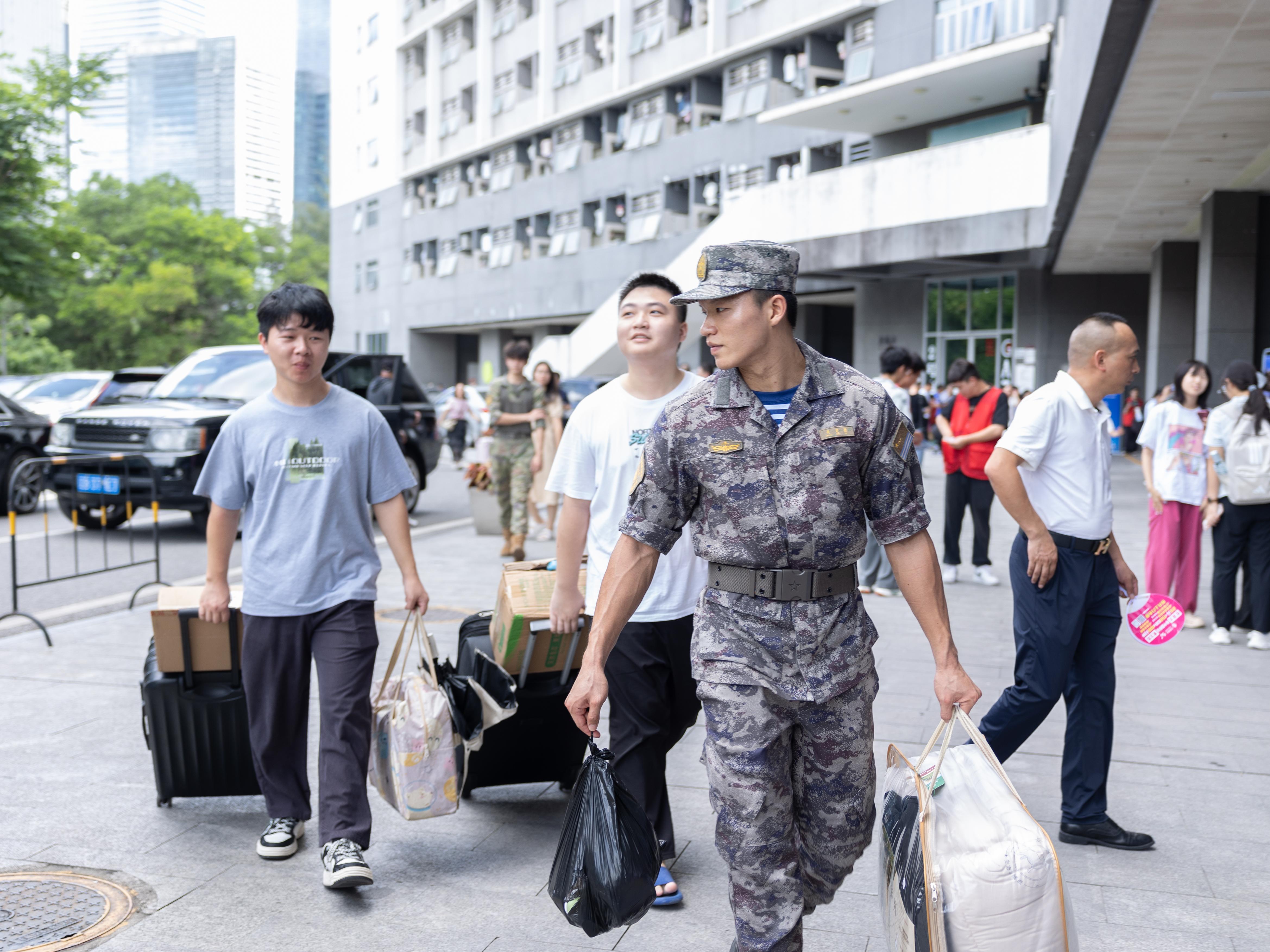 “红马甲”引人注目,迷彩服同样“炫酷”。元平体育馆前,退伍军人学生服务队以“退伍不褪色”的担当,承担行李搬运、路线指引等工作,成为迎新现场一道亮眼风景。“几年前从荔园参军去到祖国边疆,如今回归荔园为新同学服务,特别自豪。”体育学院2024 级本科生黄楚德表示。