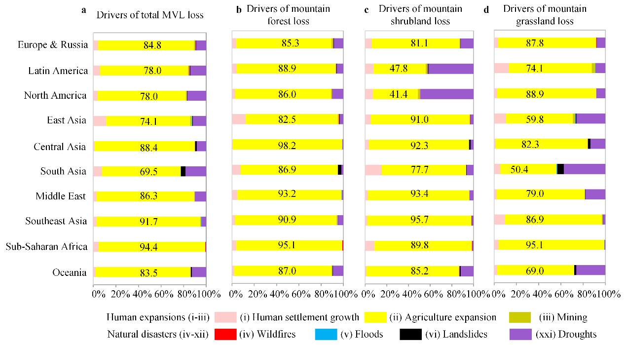 图2:2000-2020年全球十个区域MVL损失的驱动因素。a总MVL 损失的驱动因素;b山地森林损失的驱动因素;c山地灌丛损失的驱动因素;d山地草地损失的驱动因素。