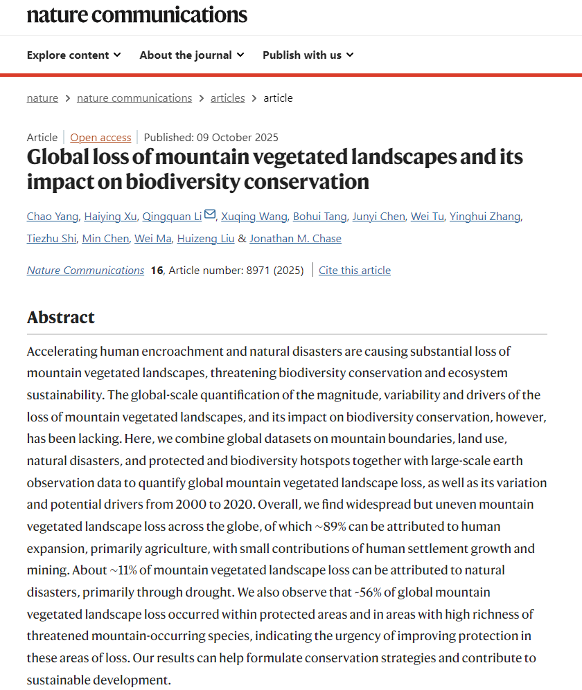 近日,芒果体育李清泉院士和杨超研究员联合多家科研机构发文,揭示人类活动与自然灾害造成的全球山地植被景观丧失及其对生物多样性保护的影响。相关研究成果以“Global loss of mountain vegetated landscapes and its impact on biodiversity conservation”(全球山地植被景观丧失及其对生物多样性保护的影响)为题在国际学术期刊《自然·通讯》(Nature Communications,自然指数期刊)正式发表(https://doi.org/10.1038/s41467-025-64449-0)。
