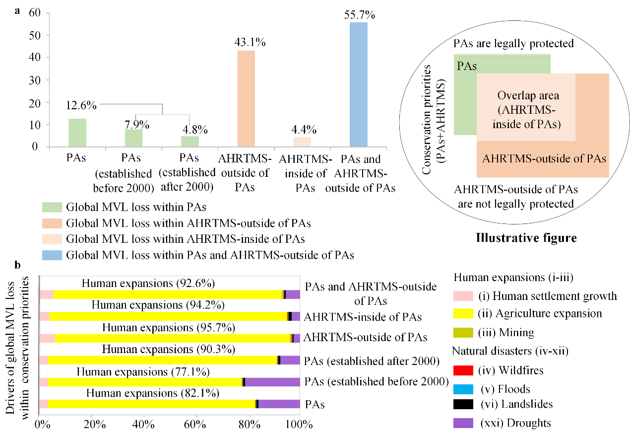图3:2000-2020年生物多样性保护优先区域(即 PA(保护区)和 AHRTMS(山地受威胁物种高丰度地区))的全球 MVL 损失。aPAs 和 AHRTMS 中 MVL 损失的比例;bPAs和 AHRTMS 内 MVL 损失的驱动因素。