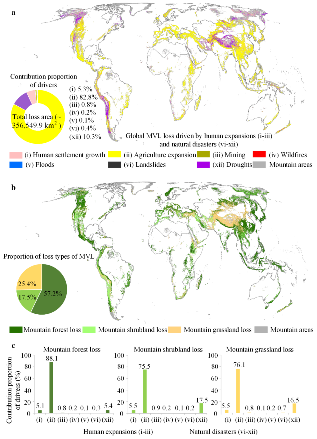图1:2000-2020年全球山地植被景观丧失的空间分布与驱动因素。该地图报告了导致 MVL 损失的七个驱动因素,包括 (i)人类居住区增长、(ii)农业扩张、(iii)采矿、(iv)野火、(v)洪水、(vi)滑坡和(xii)干旱。b 森林、灌丛、草地三类植被的损失比例;c 各类驱动因素对不同植被类型损失。
