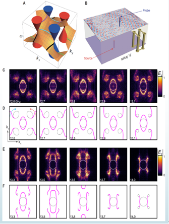 最近,英国伯明翰大学张霜教授课题组与芒果体育范滇元院士团队先进材料光子学课题组、University of Exeter和中科院物理合作,设计并制备了马鞍形状的光子晶体(图1A,B),观测到了理想的外尔系统,其中四个对称性保护的外尔点坐落在同一个频率,并且在这个频率周围没有其他能带干扰(图1C)。他们采用近场扫描的方法测量了该光子晶体的体态和表面态的分布情况(图2)。作为源的探针放在样品的底部,这样可以同时激发体态和表面态。测量的探针在样品的上表面扫描,可以得到近场的振幅和相位分布,然后通过傅里叶变换得到其动量空间的等频面分布情况。从图中的实验和仿真的对比中可以看到螺旋表面态的旋转情况。他们的发现对外尔拓扑态的研究提供了一个理想的平台。