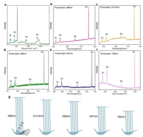 图2(a)ZnO的拉曼谱;(b-f)ZnO-石墨烯超晶格在不同泵浦光激发下的激光光谱,对应泵浦光波长分别为b)488nm,c)514.5nm,d)568nm,e)647nm,f)785nm,泵浦功率为3.2kW /cm2; (g) 拉曼散射过程的能级图,其中拉曼振动模V1-V4对应图(a)中的V1-V4,能级图中的四个散射光E1-E4对应拉曼激光中的E1-E4。