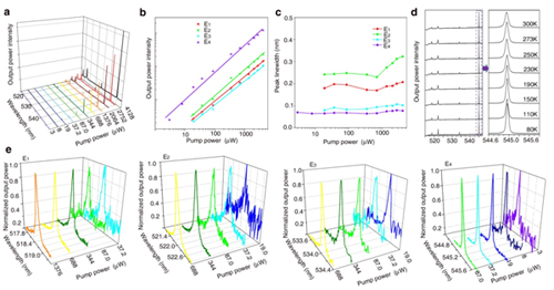 图3(a)在不同泵浦功率514.5nm激光激发下得到的激光光谱;(b)拉曼纳米激光功率密度随泵浦功率的变化曲线;(c)拉曼纳米激光峰E1-E4的线宽随泵浦功率的变化曲线;(d)不同温度下的拉曼纳米激光光谱;(e)不同泵浦功率密度514.5nm激光激发下E1-E4的激光光谱图。