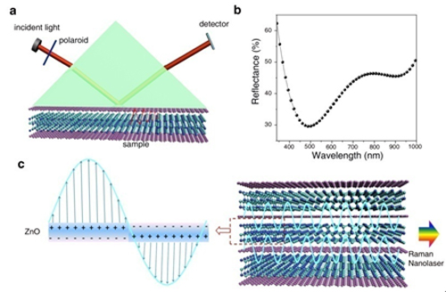 图4(a)用于研究ZnO-石墨烯超晶格表面等离子共振的Kretschmann构造示意图;(b)Kretschmann构造得到的ZnO-石墨烯超晶格表面等离子共振反射率曲线,这是由原始数据经过四阶多项式拟合得到的曲线;(c)ZnO-石墨烯超晶格界面对拉曼振动模的高度方向选择性示意图,这是无阈值拉曼纳米激光产生的重要条件。