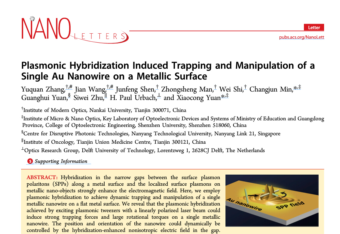 近日,光电工程学院微纳光学研究所袁小聪教授课题组在表面等离激元光镊操控金属纳米线方面研究取得新进展,在国际纳米科学技术领域权威刊物《Nano Letters》发表了题为《Plasmonic Hybridization Induced Trapping and Manipulation of a Single Au Nanowire on a Metallic Surface》的文章(DOI: 10.1021/nl502975k),我校袁小聪教授和闵长俊副教授是通讯作者,芒果体育是通讯作者单位。
