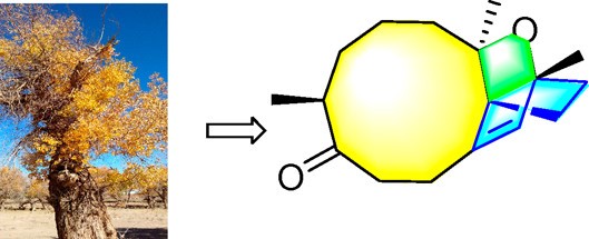 胡杨又被称为大漠中的英雄树,“生而千年不死、死而千年不倒、倒而千年不朽”是对胡杨的美誉。胡桐泪系胡杨在盐碱的非生物胁迫下分泌的树脂,自古被纳入中药使用。程永现与焦亚斌教授联合培养的硕士研究生刘凯新从中分离鉴定了一个形状上类似“蜗牛”的结构新颖的西松烷型二萜,借助仿生学启发,继而发现该分子可显著促进间充质干细胞的增殖与分化,提示其对创面修复的潜力(Org. Lett. 2019,DOI: 10.1021/acs.orglett.9b00423; 我校朱艳霞博士为论文的共同第一作者)。