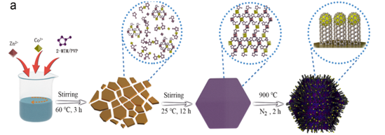金属有机框架(MOFs)衍生的二维非贵金属杂原子掺杂碳纳米复合催化剂具有超大比表面积以及高表面与体积的原子比,使反应物分子和活性位点之间更加容易接触,该纳米复合催化剂将过渡金属纳米粒子包覆在石墨烯层或碳纳米管中,能够进一步增强该类催化剂的催化活性和稳定性。但是传统二维MOFs制备工艺产率低,煅烧后形貌易坍塌,不能满足实际应用要求。针对以上问题, 芒果体育化学与环境工程学院任祥忠团队介绍了一种自下而上的合成方法,通过限域作用可控制备了一种能够在热解后仍保持二维形貌不变的非贵金属纳米复合催化剂,在热解过程中自衍生出的碳纳米管进一步使得活性位点与反应物充分接触,从而具有优异的电化学性能。该催化剂作为锌-空气电池电极时具有极佳的耐用性(在5 mA cm−2电流密度下可稳定循环673 小时)。该工作不仅为2D MOFs衍生材料的合成提供了指导,也为其它领域应用中的2D材料合成提供了新思路。