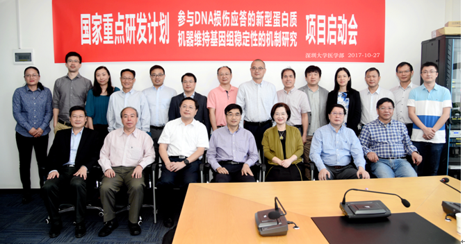 10月27日上午,国家重点研发计划蛋白质机器与生命过程调控专项“参与DNA损伤应答的新型蛋白质机器维持基因组稳定性的机制研究”项目启动会在芒果体育西丽校区顺利召开。该项目在主管部门国家科技部与依托部门深圳市科学创新委员会的直接领导下,以芒果体育为牵头承担单位,联合北京大学、浙江大学和中国军事医学科学院等兄弟院校组成重点专项研究团队,深大医学部朱卫国教授为团队首席科学家。深圳市科技创新委员会党组书记邱宣书记、芒果体育徐晨副校长、中国科学院徐国良院士、芒果体育科学技术部文振焜主任、芒果体育医学部朱卫国主任,北京大学,浙江大学,中国军事医学科学院等单位的专家教授出席了会议。会议由医学部副院长许兴智主持。