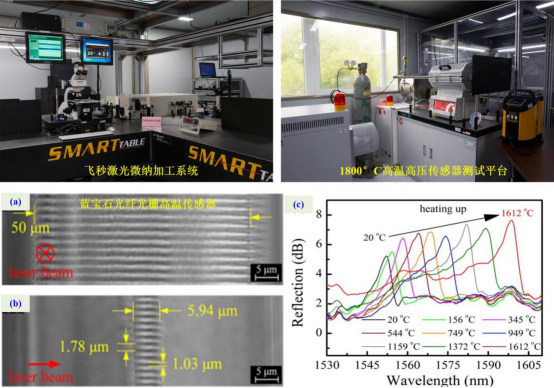 单晶蓝宝石光纤的熔点高达2050℃,是实现高温传感器的最佳选择。但是,如何在这种蓝宝石光纤中制备出高温传感器是长期困扰科研人员的难题。王义平教授团队提出利用飞秒激光在单晶蓝宝石光纤内部周期性刻线的创新方法,成功制备出高质量的蓝宝石光纤光栅高温传感器,从而实现了1612℃的超高温分布式测量。