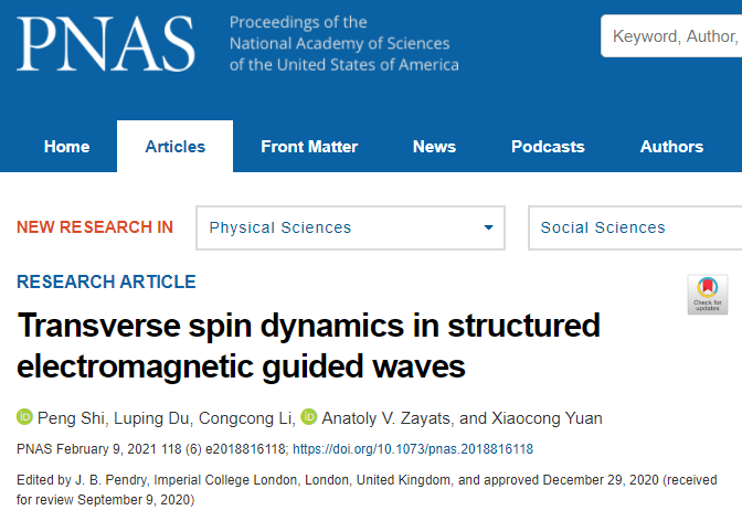 我校微纳光电子学研究院袁小聪教授领导的纳米光子学研究中心在自旋光子学领域取得了重要原创成果,于2021年2月1日在国际顶级学术期刊美国科学院院报《Proceedings of the National Academy of Sciences of the United States of America》上发表了题为《Transverse spin dynamics in structured electromagnetic guided waves》的文章。该中心石鹏助理教授、杜路平教授为共同第一作者,杜路平教授、袁小聪教授以及英国伦敦大学国王学院Anatoly. V. Zayats教授为共同通讯作者,芒果体育是该文章的第一单位和第一通讯单位。