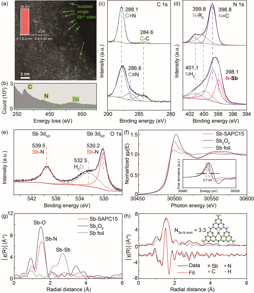 Sb-SAPC15的高分辨扫描透射高角度环形暗场像中亮点的大小部分均小于0.2 nm。Sb-SAPC15的电子损失谱说明该区域由C, N, Sb构成,也表明Sb元素存在于PCN的结构中 (4a-b)。 4c-e, PCN的高分辨率C 1s(c)N 1s 光电子能谱光谱(d)Sb-SAPC15Sb 3d XPS光谱说明,Sb可能与N原子成键,且化合价接近+3 (4c-e)。Sb, Sb2O5Sb-SAPC15Sb-K X射线近边吸收谱和精细结构谱表明XANES和傅立叶变换扩展X射线吸收精细结构(FT-EXAFS)光谱(4 f-h)进一步说明了Sb的价态接近+3。从DFT优化获得的模型拟合Sb-SAPC15EXAFS数据说明,Sb与周围N原子的平均配位数为3.3。